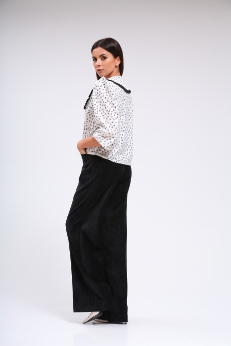 Блузка из тонкой блузочной ткани, длиной до линии бёдер, с рукавами длиной ниже локтя, с плосколежащим воротником. Перед, с нагрудными вытачками из боковых швов, с рюшем из отделочной ткани в шве притачивания планки к краю борта. Спинка без особенностей. Рукава со сборкой по окату, низ рукавов собран на эластичную тесьму. Воротник с вытянутыми скруглёнными концами, в шов обтачивания входит рюш из отделочной ткани. Застёжка по краю борта на петли и пуговицы. Низ блузки прямой с притачным рюшем из отделочной ткани.