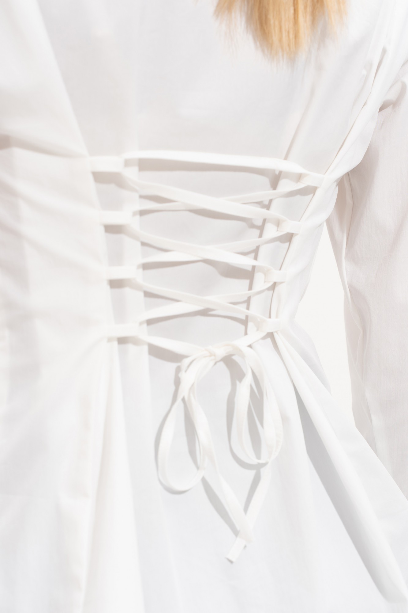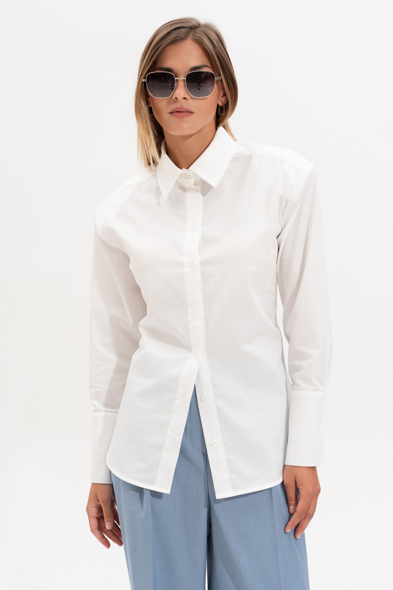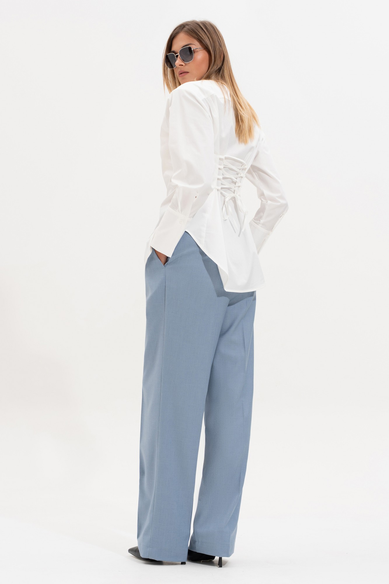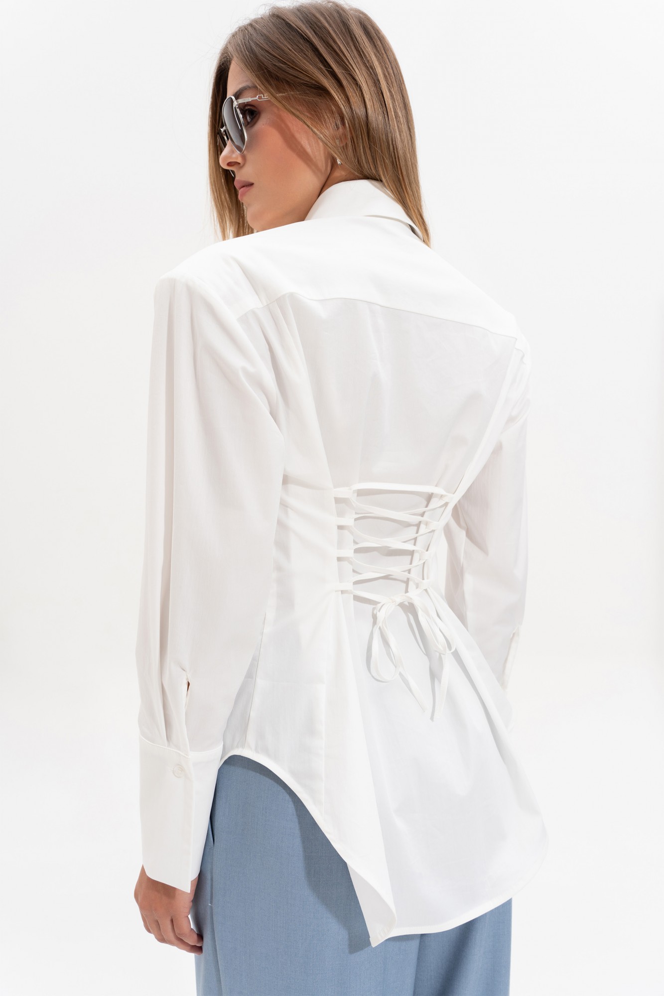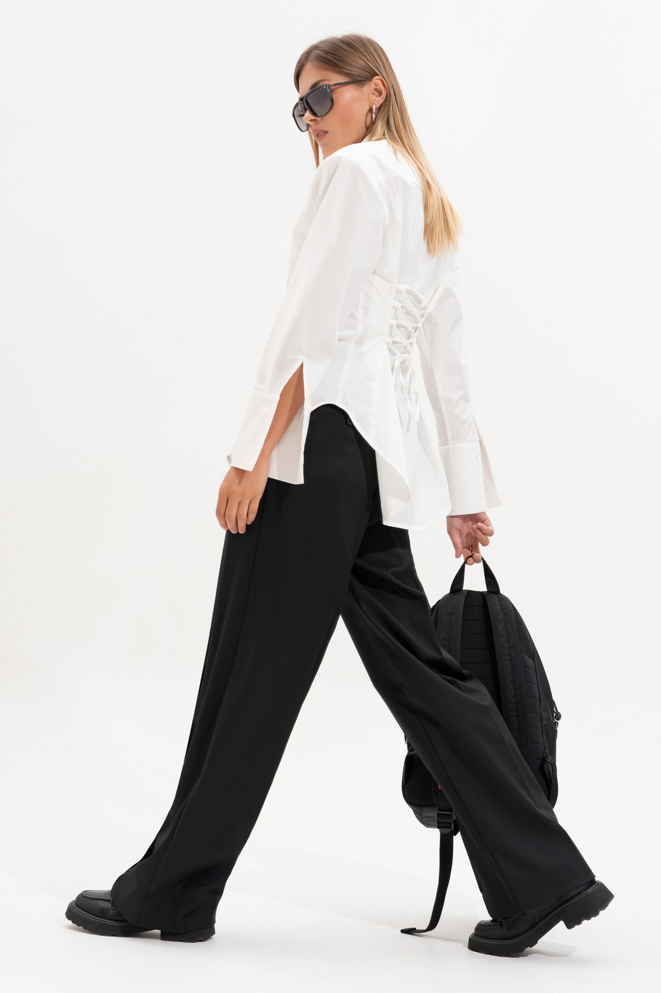 Блузка женская, актуального кроя, буквально украшает свою владелицу: деликатно расширяет плечи, акцентирует талию за счет шнуровки на спине. Рукав втачной, с плечевой накладкой и притачной манжетой, застегивающейся на 1 пуговицу. Воротник стояче-отложной с отрезной стойкой. Линия низа фигурная. Стильная, современная блузка легко встраивается в современный гардероб для любительниц office и old money core.