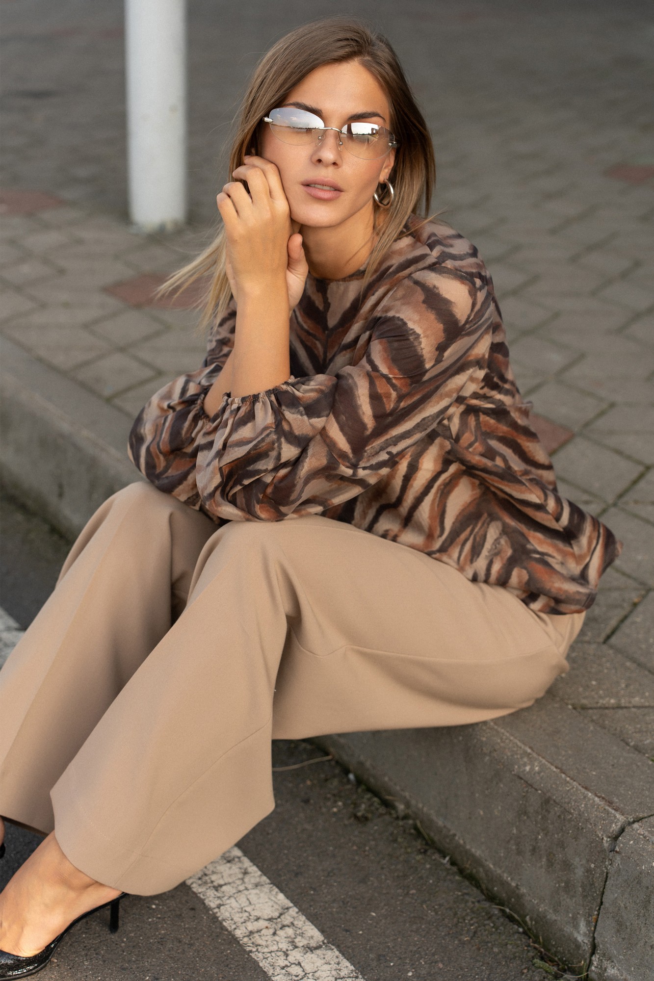 Блузка свободного силуэта, слегка расклешенная к низу. Рукав втачной, расширенный к низу, на резинке. По центру спинки обработана застежка на навесную петлю с пуговичкой.