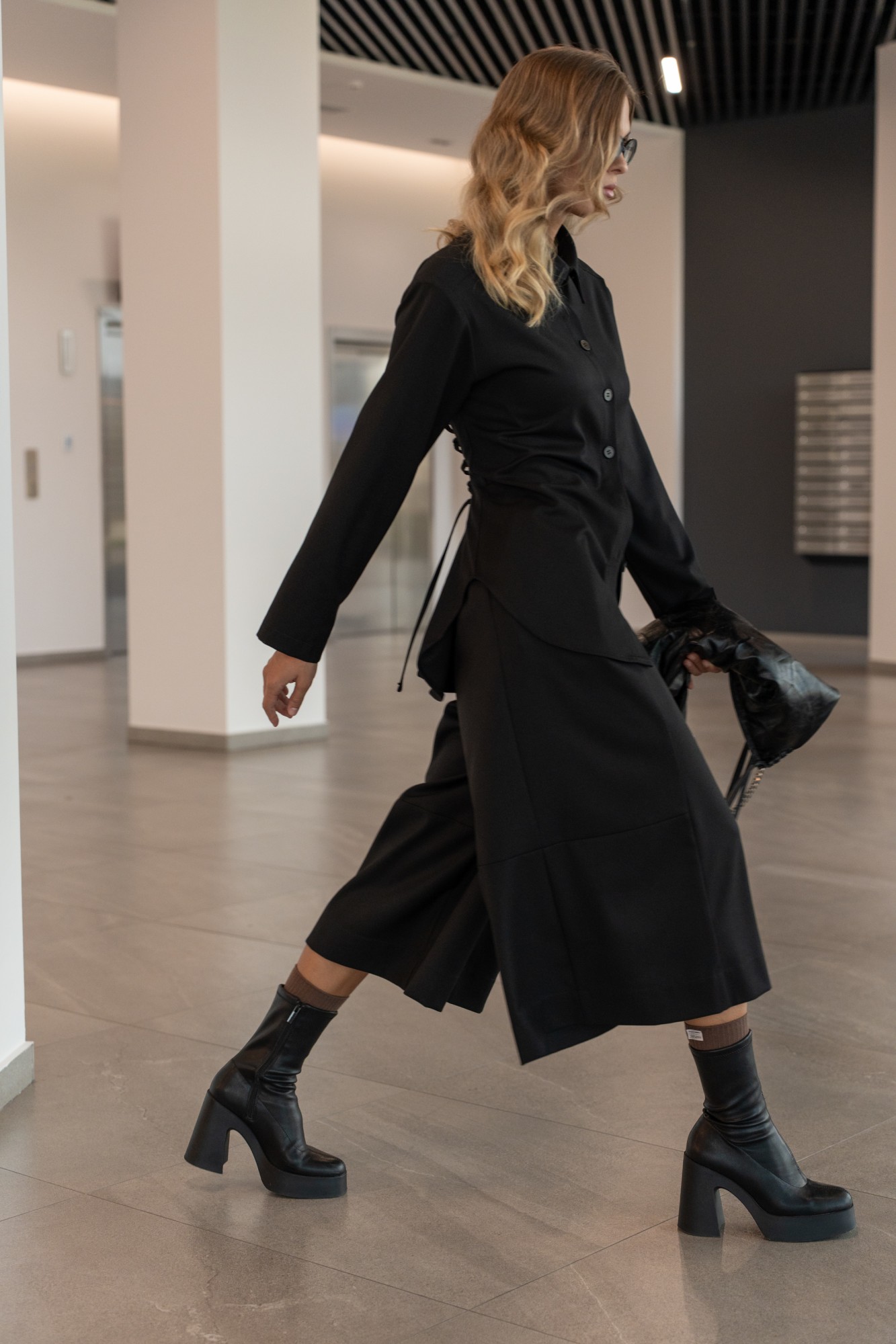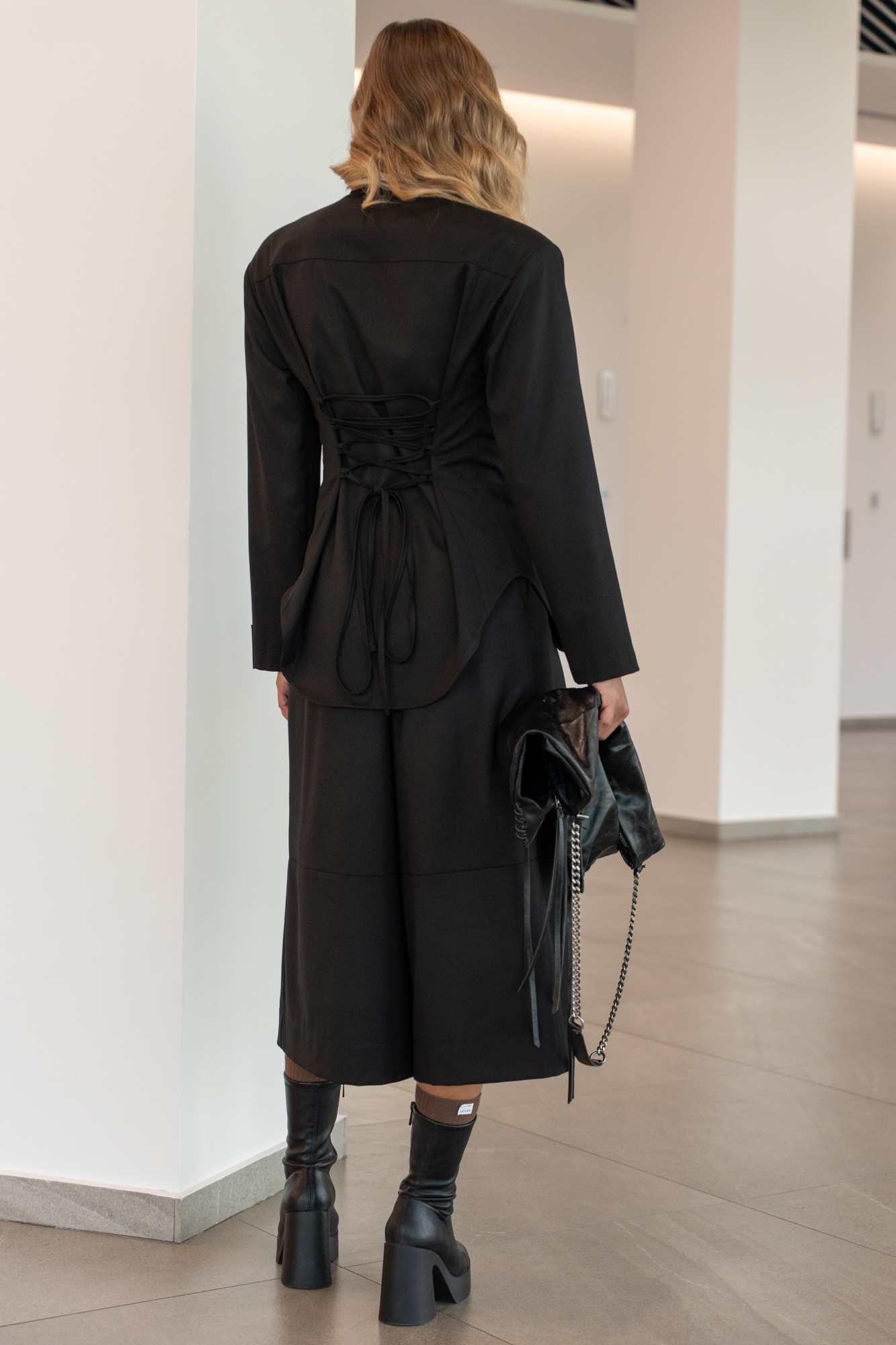 Блуза женская, актуального кроя, буквально украшает свою владелицу: деликатно расширяет плечи, акцентирует талию за счет шнуровки на спине. Рукав втачной, одношовный, с настрочной декоративной биркой. Воротник стояче-отложной с отрезной стойкой. Линия низа фигурная.