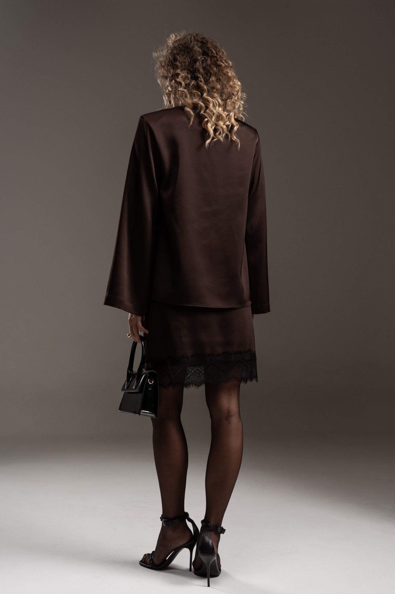 Блузка свободного силуэта, с подплечниками, в глубоком шоколадном оттенке с деликатным сатиновым блеском. Рукав втачной, прямой. По центру спинки обработана застежка на навесную петлю с пуговичкой.