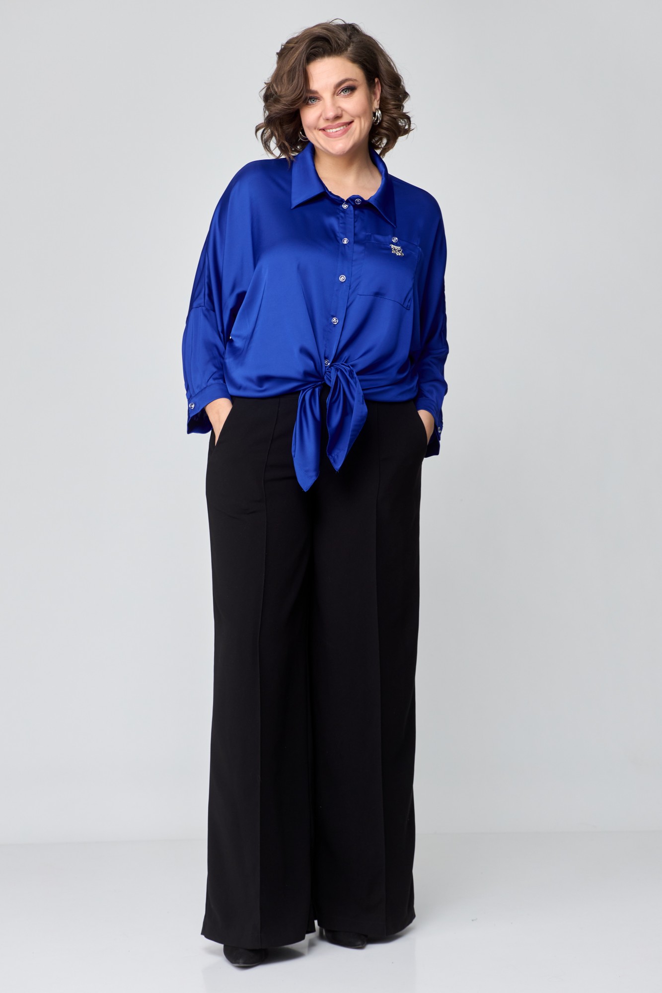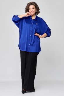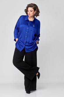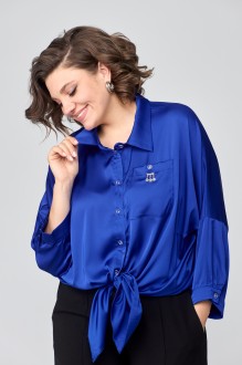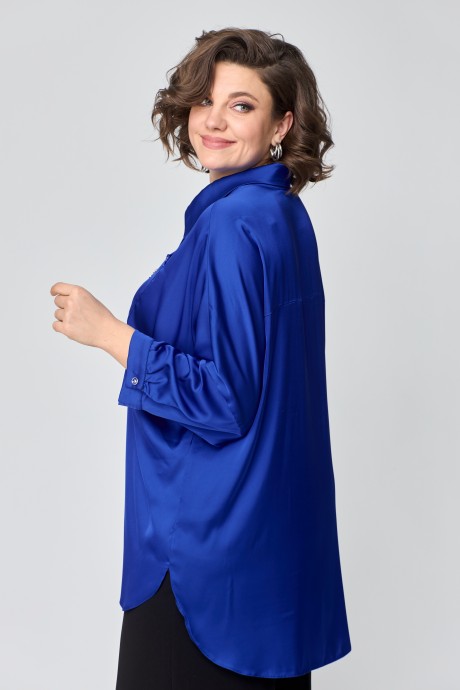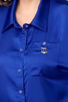 Блузка для женщин разной возрастной категории и разного телосложения. Блузка удлиненная, свободного кроя. Застежка-планка с прорезными петлями на пуговицах. На передней части блузки карман на левой половине. Спинка свободного кроя без талиевых вытачек. По центру спинки кокетка. Воротник рубашечного типа. Низ изделия с фигурными вырезами по боковому шву. Украшением изделия служит брошь на кармане. Линия плеча спущенная, рукав притачной, по низу рукава манжет с застежкой на пуговицу.