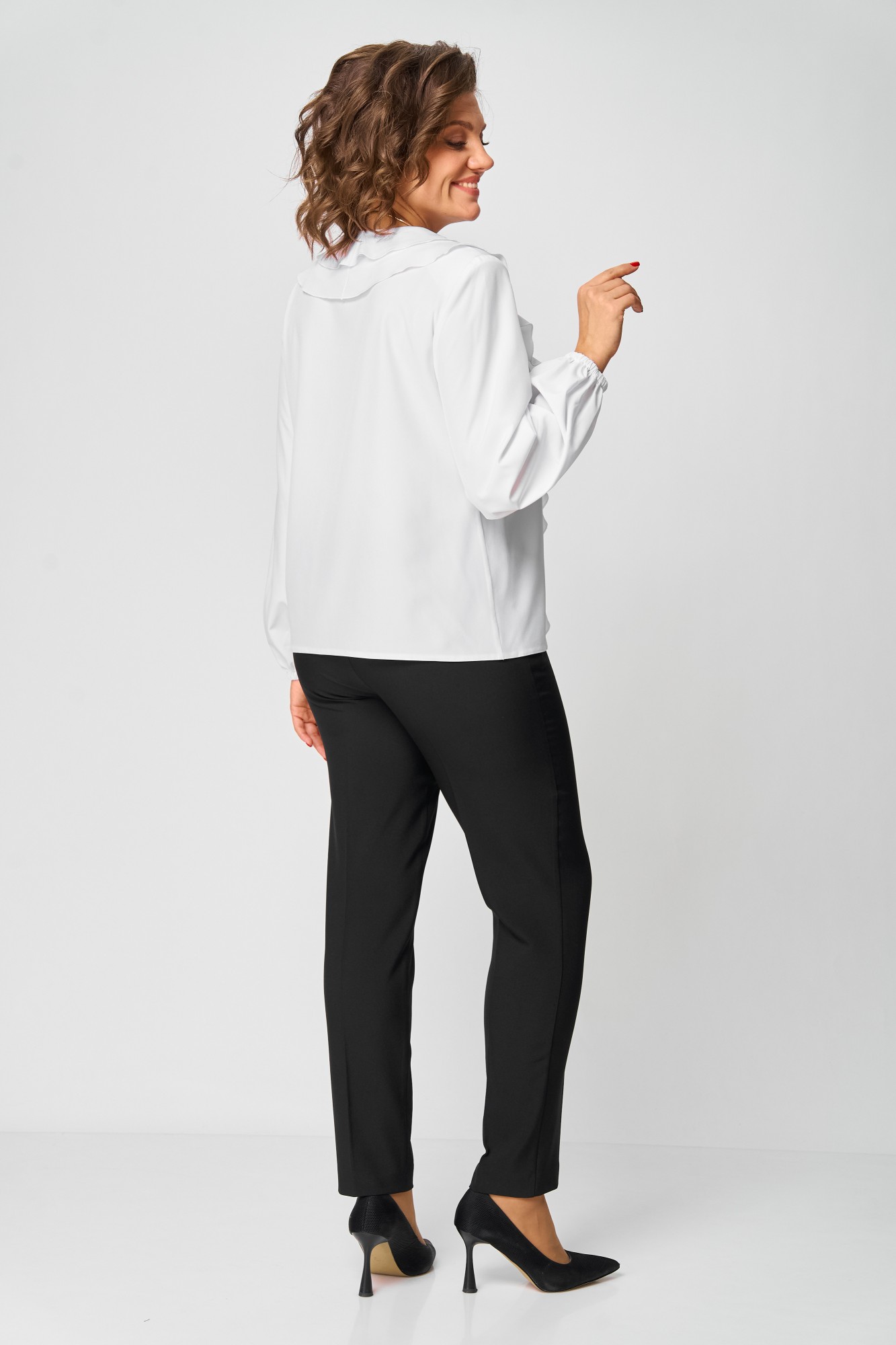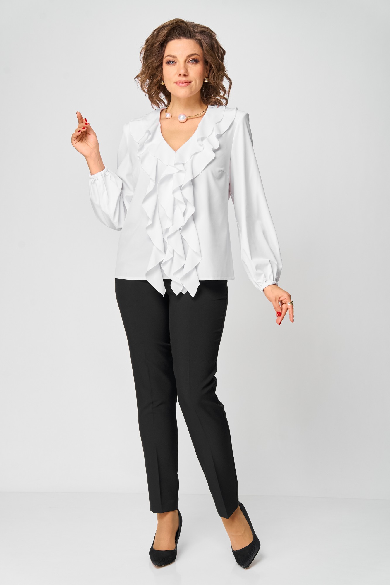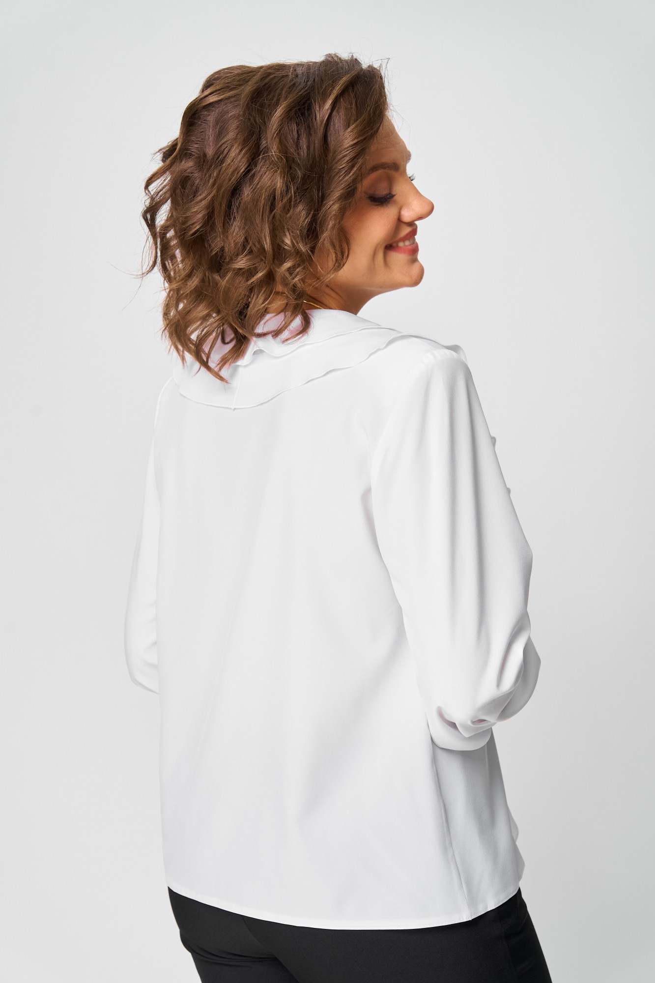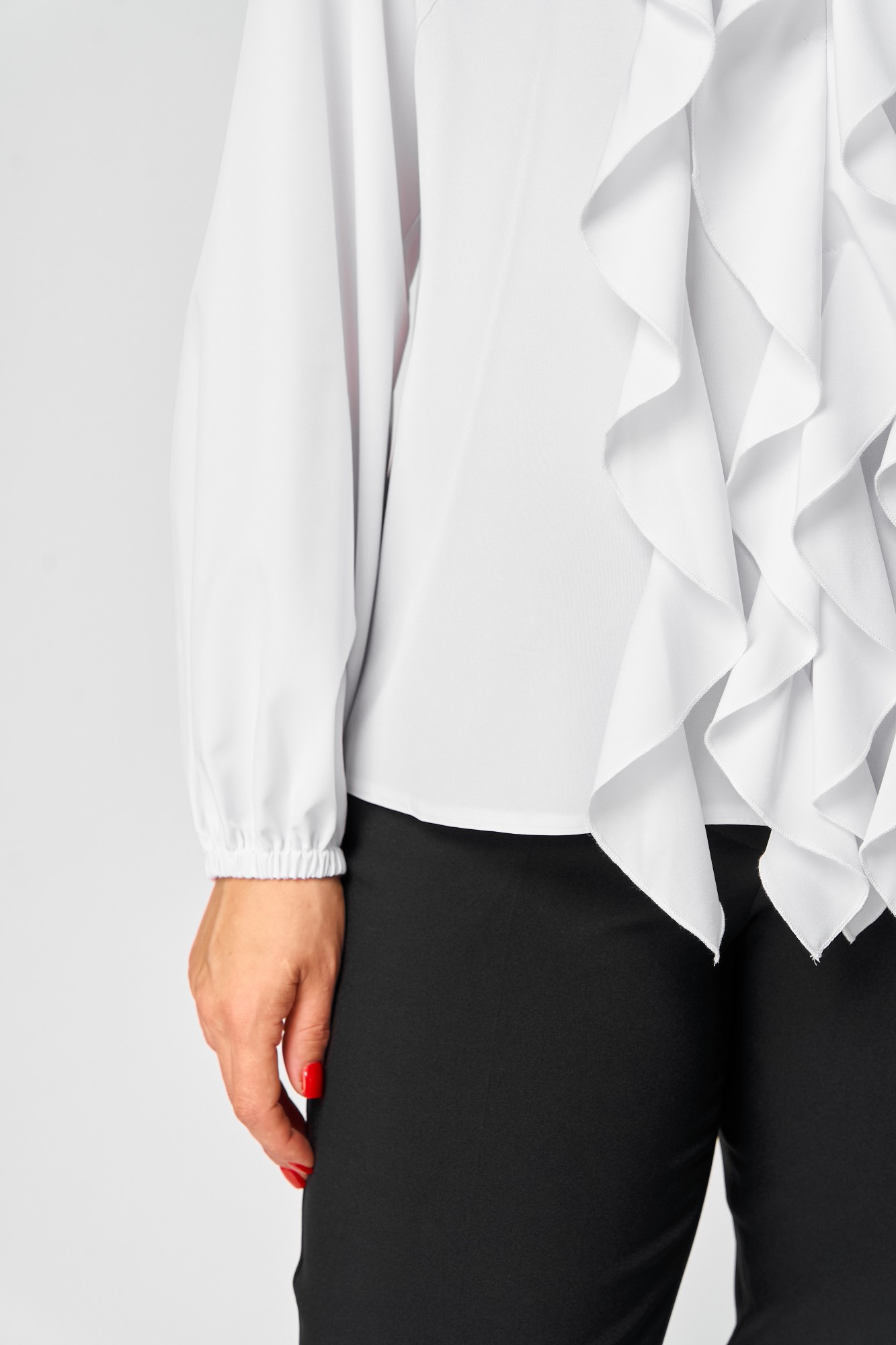 Блузка женская прямого кроя с втачным рукавом. Вырез горловины v- образной формы, оформлен двумя рядами воланов переходящими в шов по переду. По линии груди вытачки. Спинка цельная. Рукав длинный расширенный к низу собран на резинку.