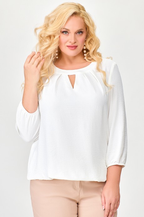 Блуза женская прямого силуэта, выполнена из эластичной вискозной ткани с эффектом крэш. Перед блузы цельнокроеный. Горловина круглая, обработана обтачкой. От центральной части обтачки обработан фигурный вырез и четыре встречные складки. Спинка цельнокроеная. Рукава 4/5, втачные. По низу рукава и по низу блузки вставлена эластичная тесьма, которая позволяет регулировать длину рукава и длину изделия.