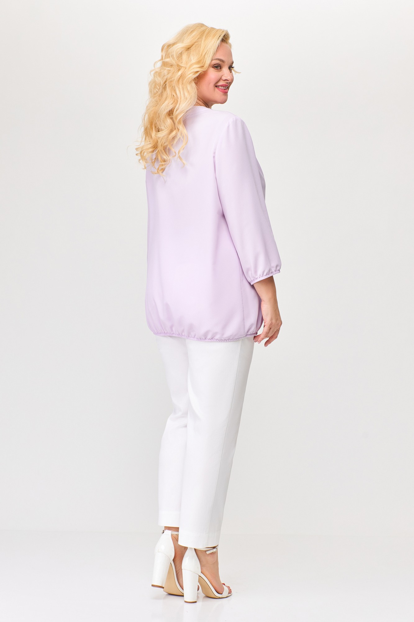 Блуза женская прямого силуэта, выполнена из эластичной вискозной ткани с эффектом крэш. Перед блузы цельнокроеный. Горловина круглая, обработана обтачкой. От центральной части обтачки обработан фигурный вырез и четыре встречные складки. Спинка цельнокроеная. Рукава 4/5, втачные. По низу рукава и по низу блузки вставлена эластичная тесьма, которая позволяет регулировать длину рукава и длину изделия.