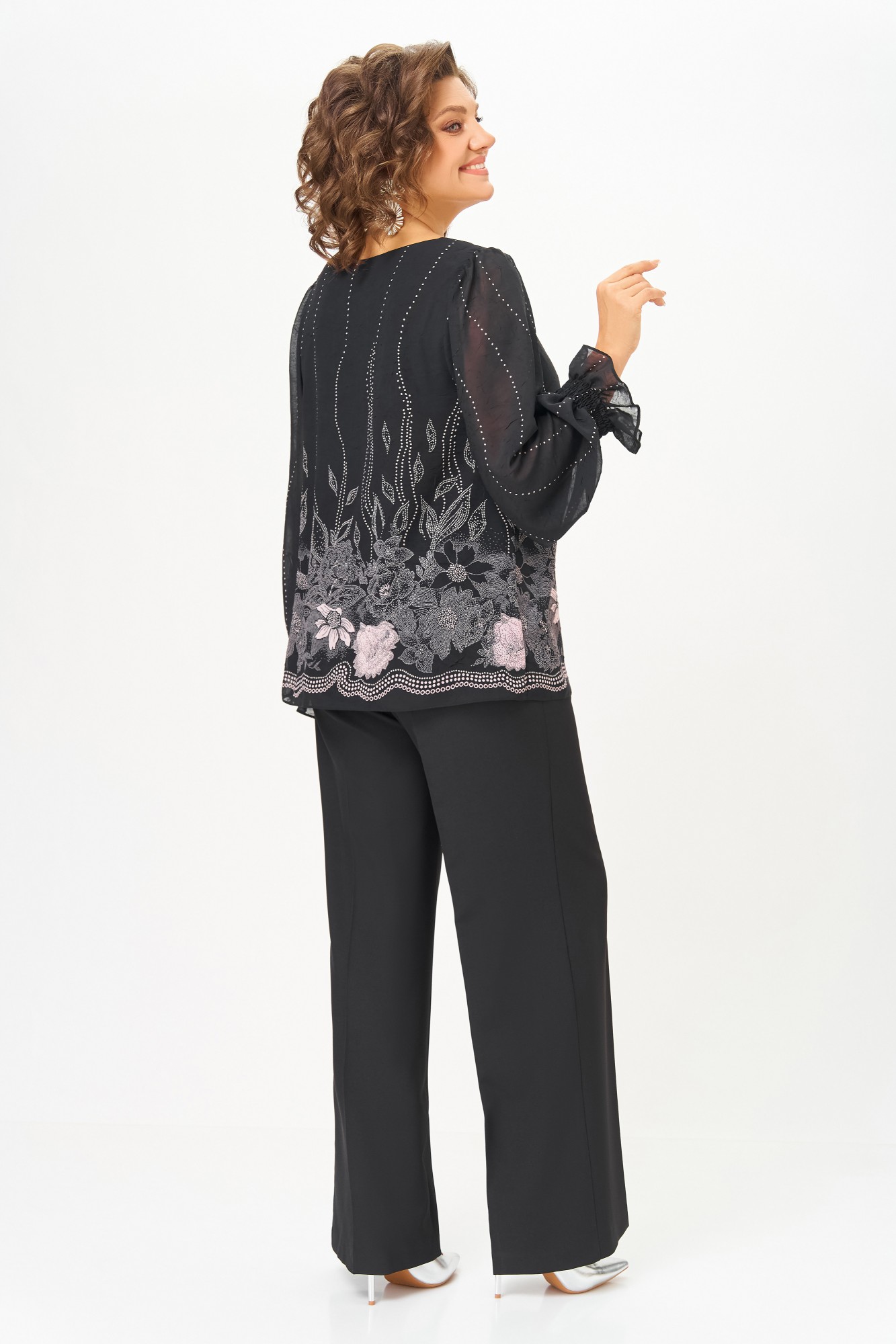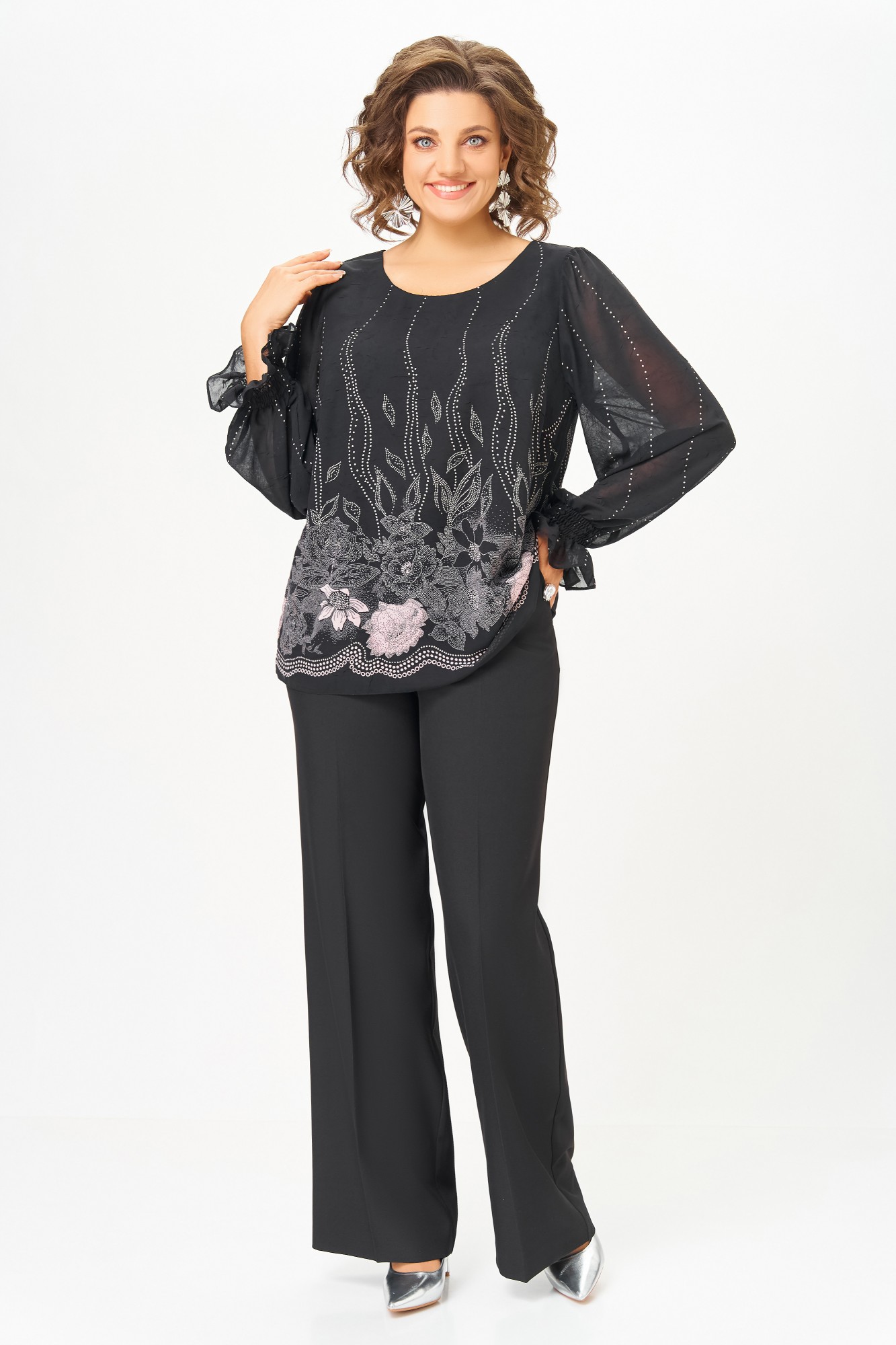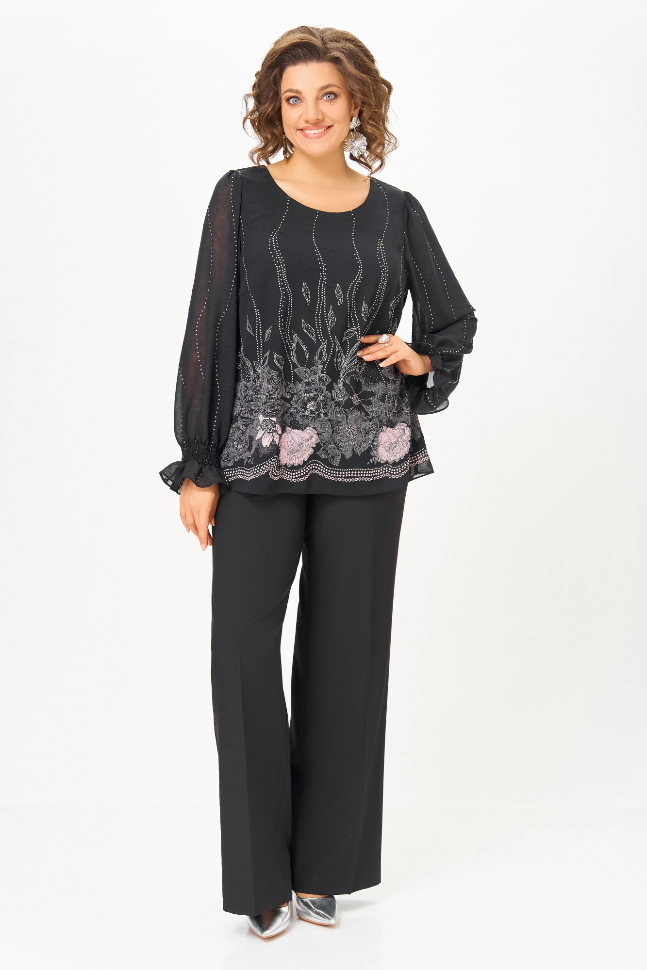 Блузка А-силуэта из нежной шифоновой ткани с лёгким эффектом «жатки», на подкладке из шифона. Полочка с нагрудными выточками, спинка без особенностей. Горловина круглая. Рукав втачной длинный по окату со сборкой, в нижней части собран на эластичную нить, которая внизу образует рюшу высотой 6 см.