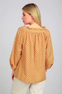 Блуза свободного силуэта, приталивается с помощью пояса. Застежка центральная, на фигурную планку. В верхней части планки завязывается бант. Горловина круглая, на обтачке, верхний край которой отделан рюшей. Рукав длиной 3/4 «реглан», в верхней части оката присборен , что позволяет скрыть полноту рук, особенно в верхней части .