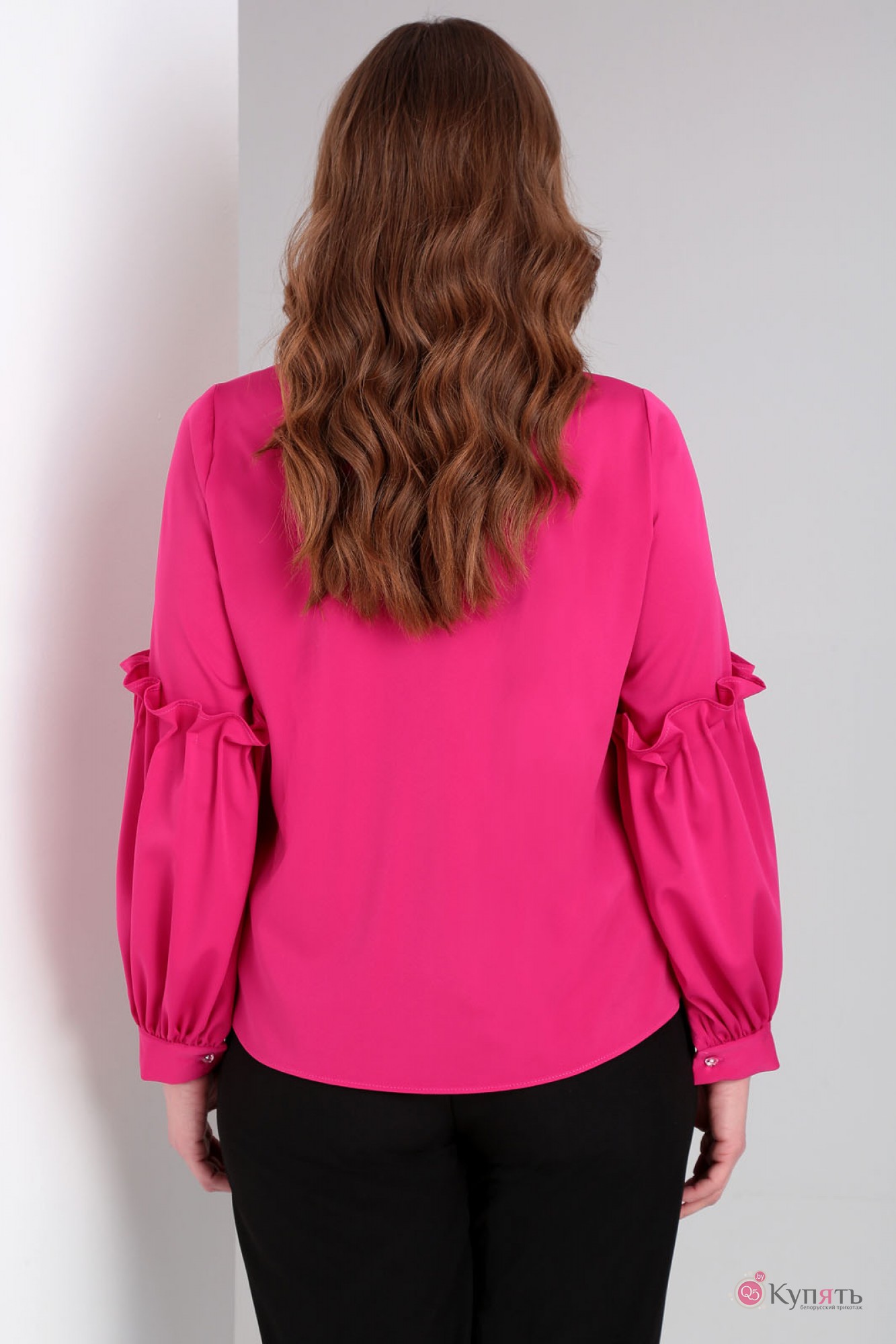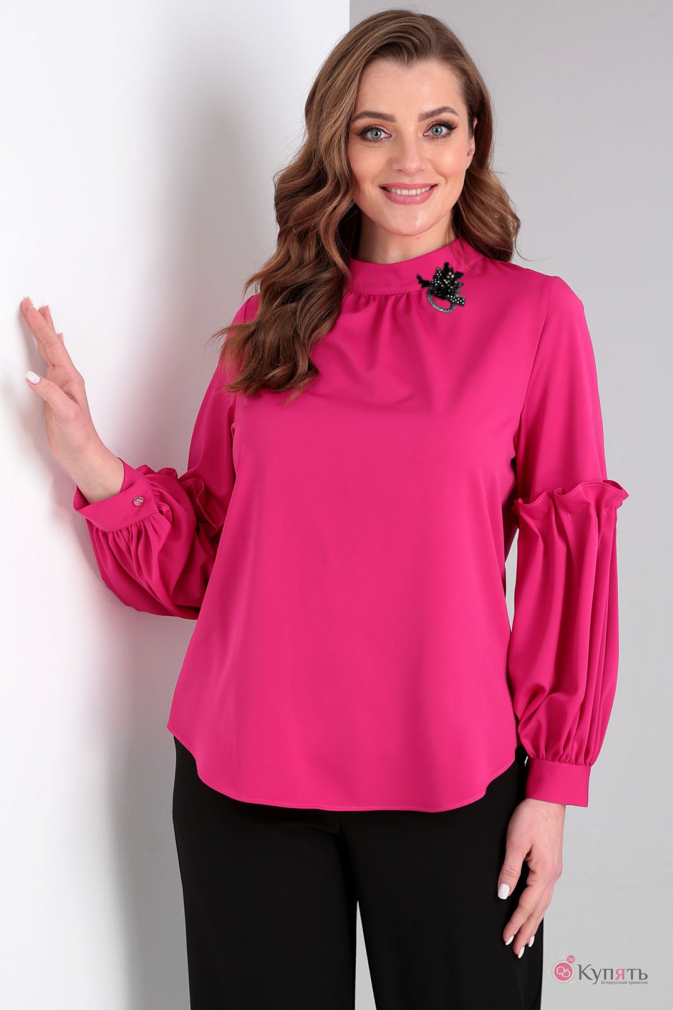 Нарядная блуза прямого, свободного силуэта, с застежкой на навесные петельки по центру спинки. Воротник-стойка, по центру переда от которой собирается сборка к линии груди. Рукав состоит из верхней части и нижней, нижняя часть собрана складками застроченными узорами и придающими пышность нижней части рукава. Рукав собирается по низу, на манжет.