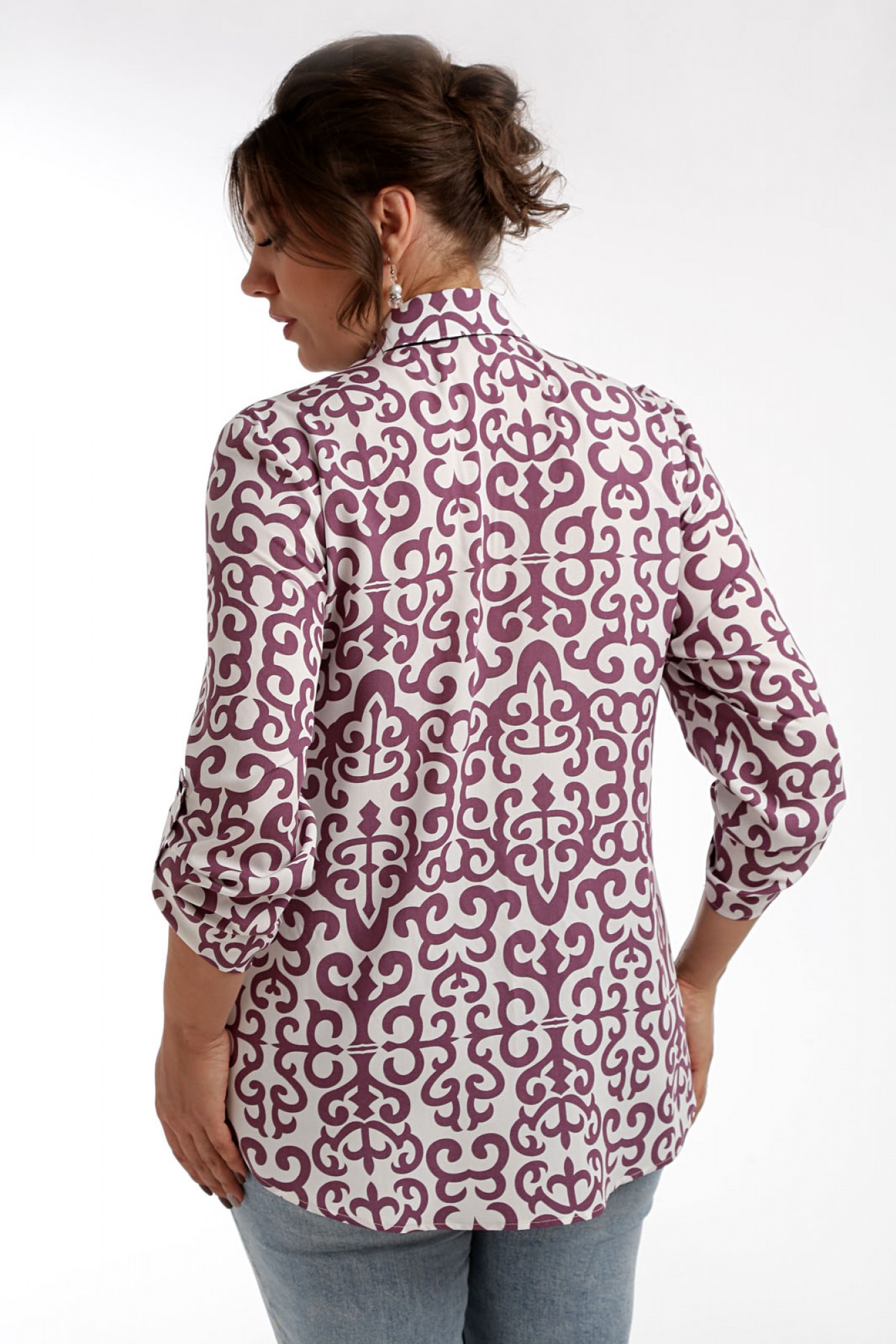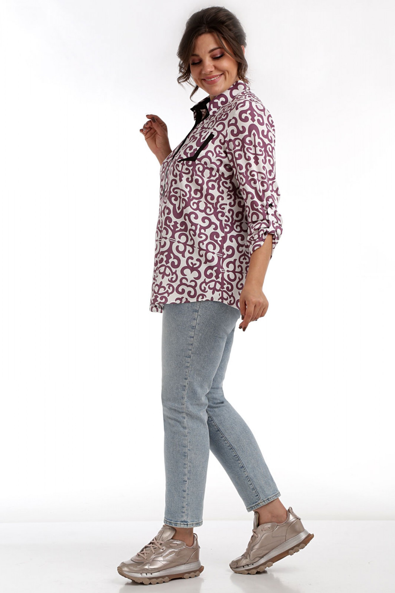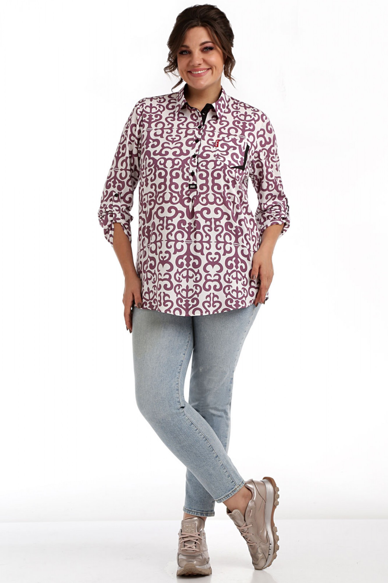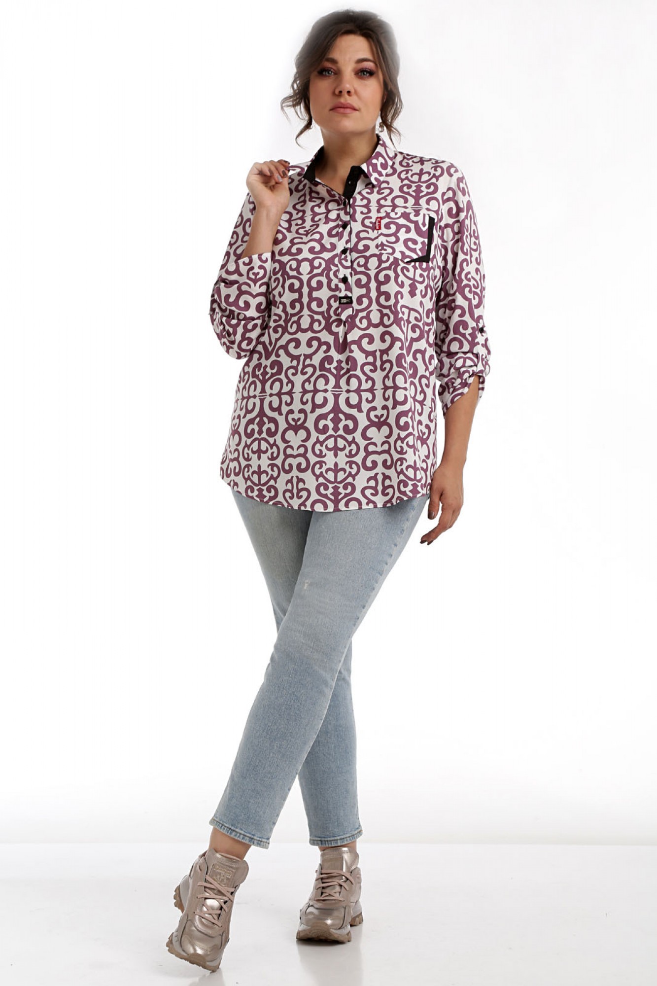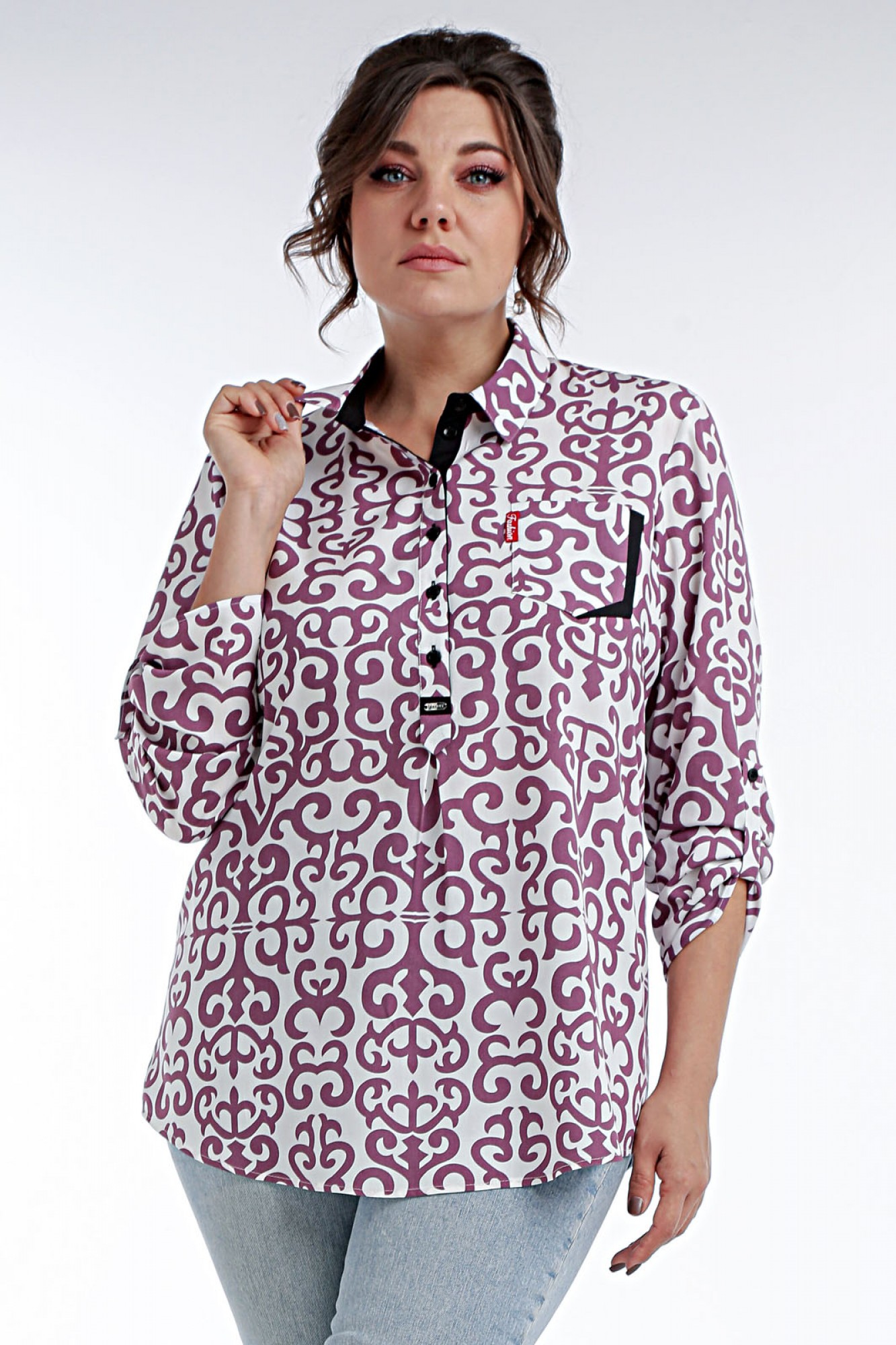 62424- Блуза рубашечного стиля представляет собой модель свободного кроя с центральной застежкой на планку по передней полочке, что добавляет ей классический вид. Воротник втачной, соответствующий стилю рубашки, дополняет общий облик изделия. Нагрудные вытачки на полочке блузы обеспечивают удобную посадку, а на левой полочке настрочен нагрудный карман, придающий модели изысканный вид. Рукав втачной, одношовный, имеет регулируемую длину, что позволяет подстраивать его под индивидуальные предпочтения. Эта блуза идеально подходит как для повседневного образа, так и для офисного стиля благодаря своему универсальному дизайну и комфортному крою. Ткань блузы мягкая и приятная на ощупь, что делает ее носку особенно комфортной в любых ситуациях.