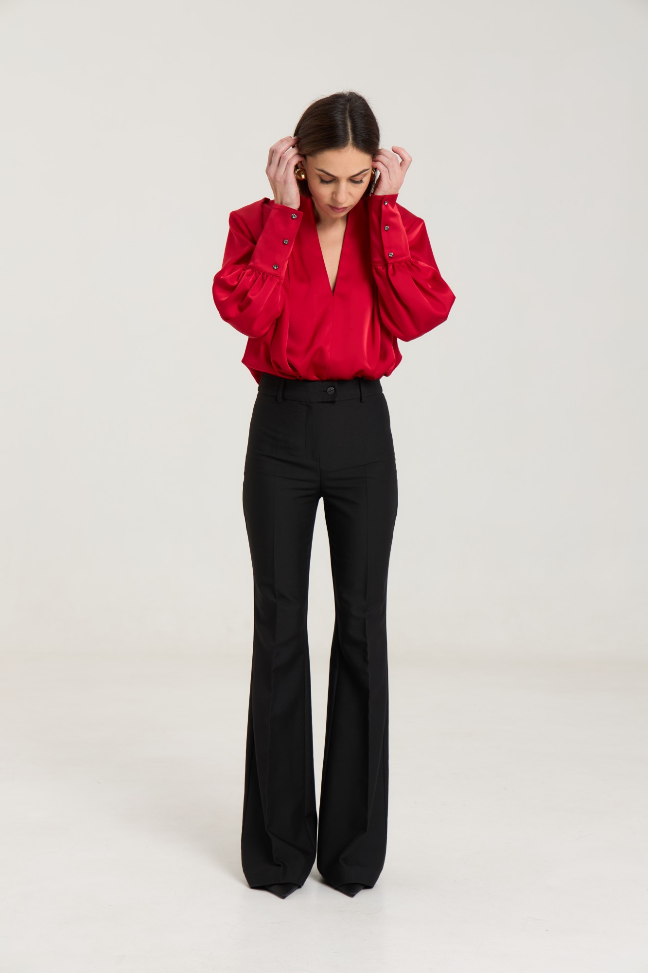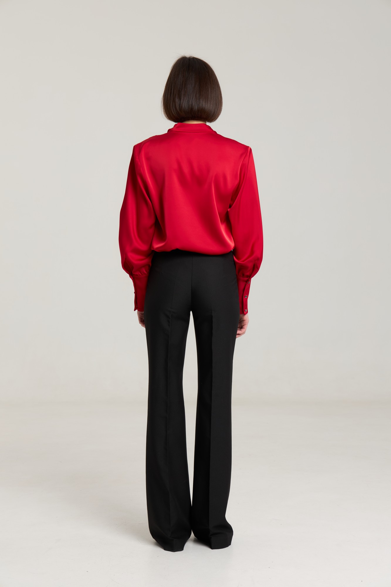Блузка свободного силуэта, горловина V-образная, рукав притачной, линия плеча зафиксирована плечевыми вставками, манжета широкая, с застежкой на петли-пуговицы. Блуза выполнена из плотной атласной ткани молочного цвета, ткань не просвечивает.