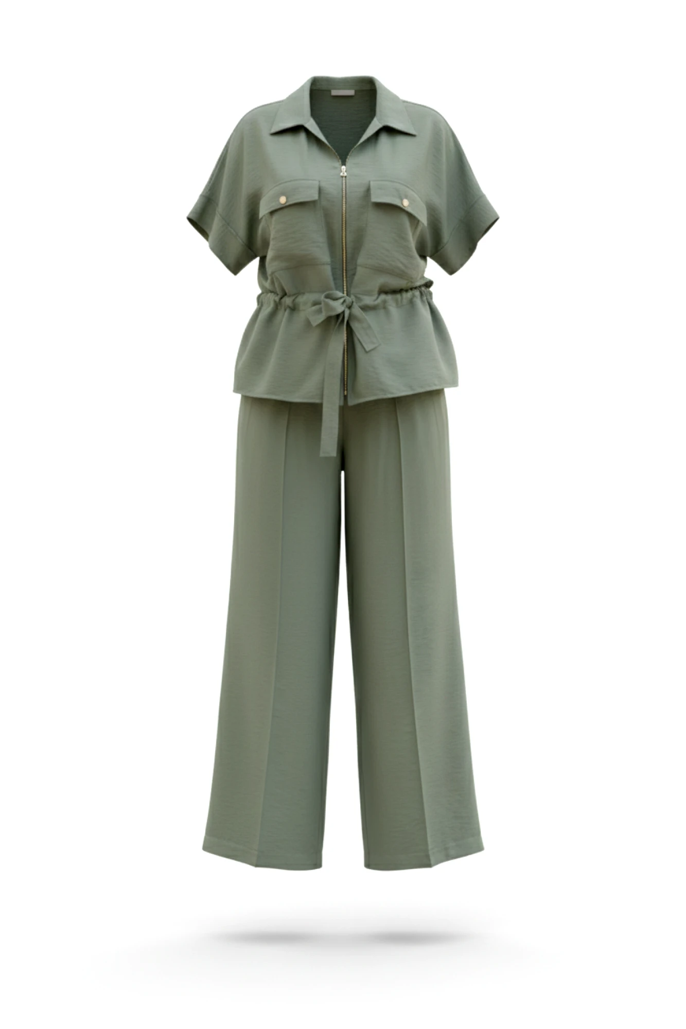 Оттенок хаки — это не просто цвет, а целая история. Он меняется в зависимости от освещения: при ярком солнце становится теплее, в тени приобретает холодный оливковый подтон. Ткань с лёгкой фактурой, не идеально гладкая, а имеет микронеровности, которые создают игру света и тени. Блузка не обтягивает, а свободно ниспадает, создавая ощущение лёгкости и свободы. Она может быть приталенной — с поясом в кулисе по талии. Прямого кроя — для более андрогинного образа. Слегка «oversize» — для современной интерпретации. Блузка свободного силуэта с отложным воротником, застёжкой на функциональную тесьму-молнию по борту. Рукав в блузке цельнокроеный с притачной широкой манжетой по низу. По переду блузки накладные карманы с клапаном и декоративной кнопкой, а также кулиса с поясом из основной ткани, что позволяет создавать приталенный или прямой силуэт в зависимости от настроения. Спинка без особенностей. Боковых швах от низа разрезы. Золотая фурнитура в данной модели является главным акцентом. Концепция: блузка как единственный сложный элемент в простом образе. Сочетания: со светлыми льняными брюками; с белым низом — свежий летний вариант. Так же образ можно дополнить аксессуарами: лаконичная обувь без украшений, минималистичная сумка, тонкие цепочки или браслеты.