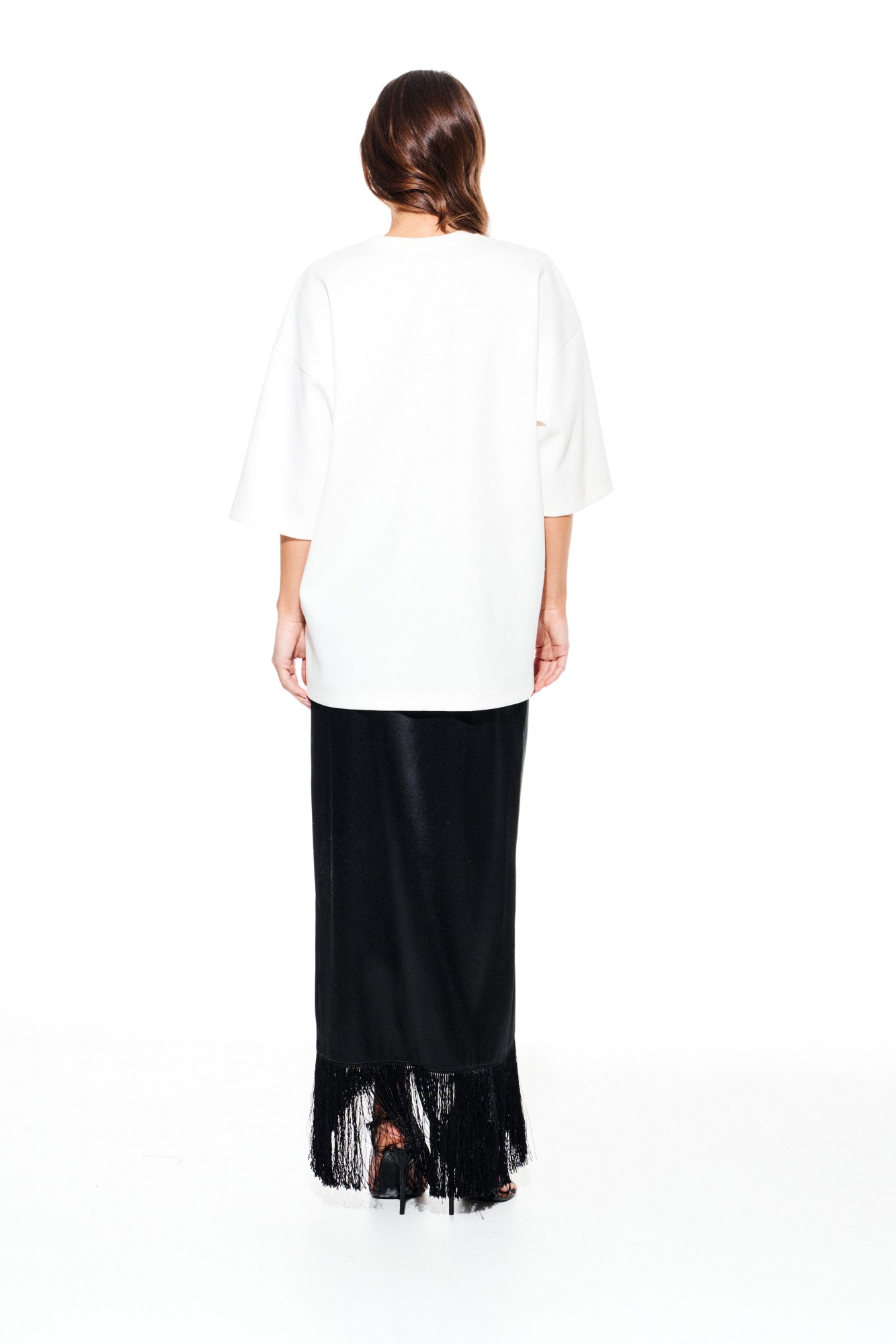 Джемпер из трикотажного полотна, свободного объема, прямого силуэта, с круглым вырезом горловины. Перед и спинка цельные. По переду выполнена печать "Цепи".