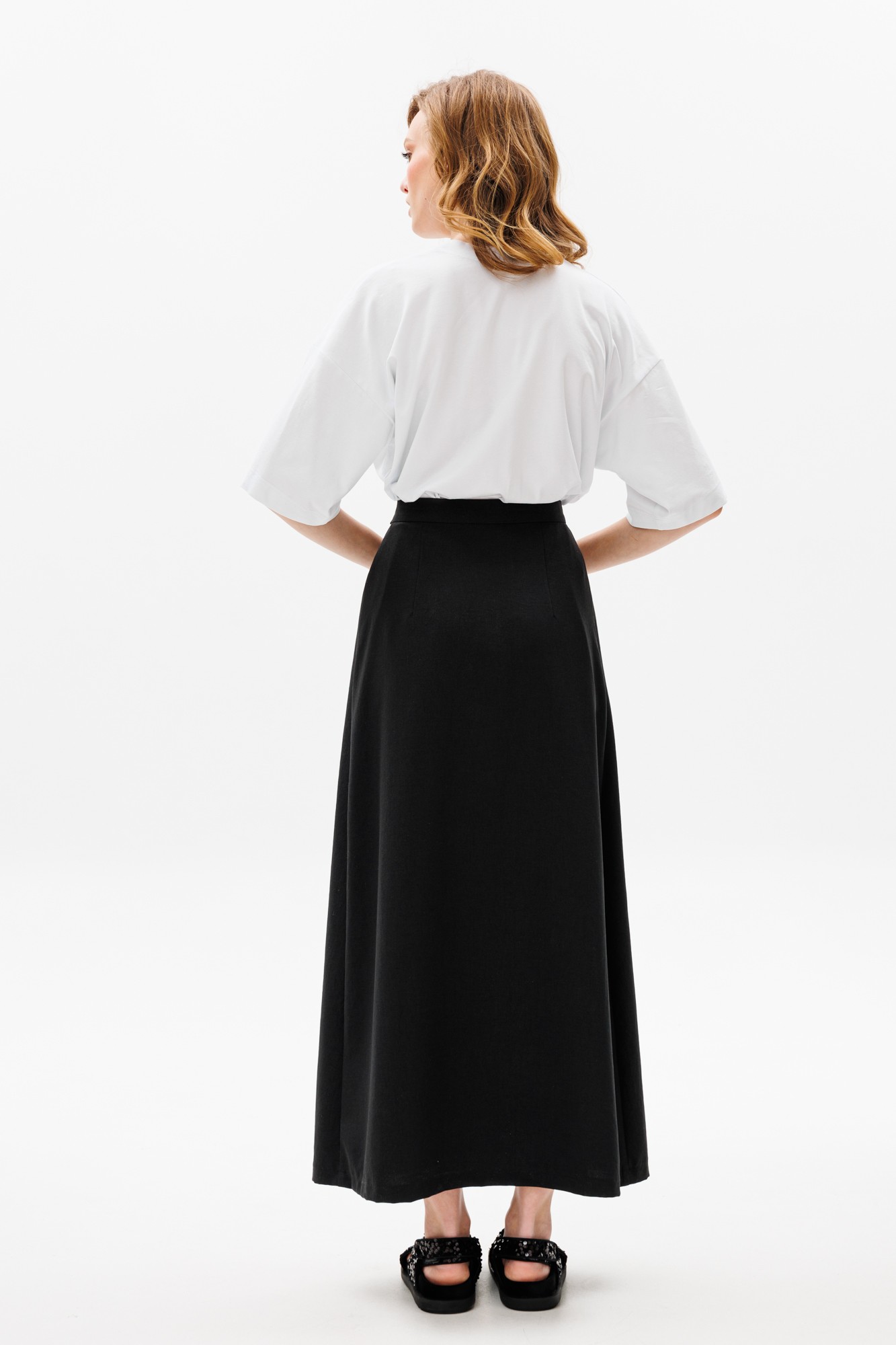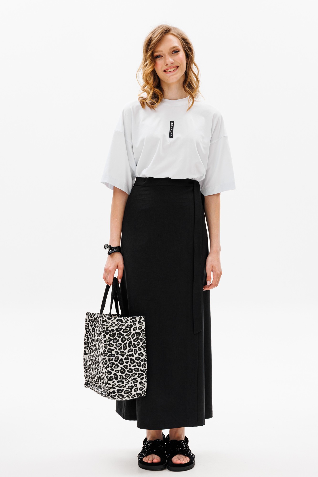 Футболка выполнена из трикотажного полотна, прямого покроя, длиной до линии бедер. Перед и спинка цельные. Горловина округлой формы. Плечевой шов спущен. Рукав одношовный, длиной до линии локтя. Перед декорирован принтом.