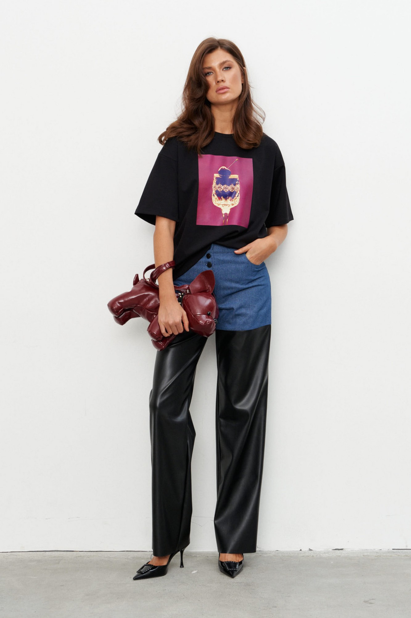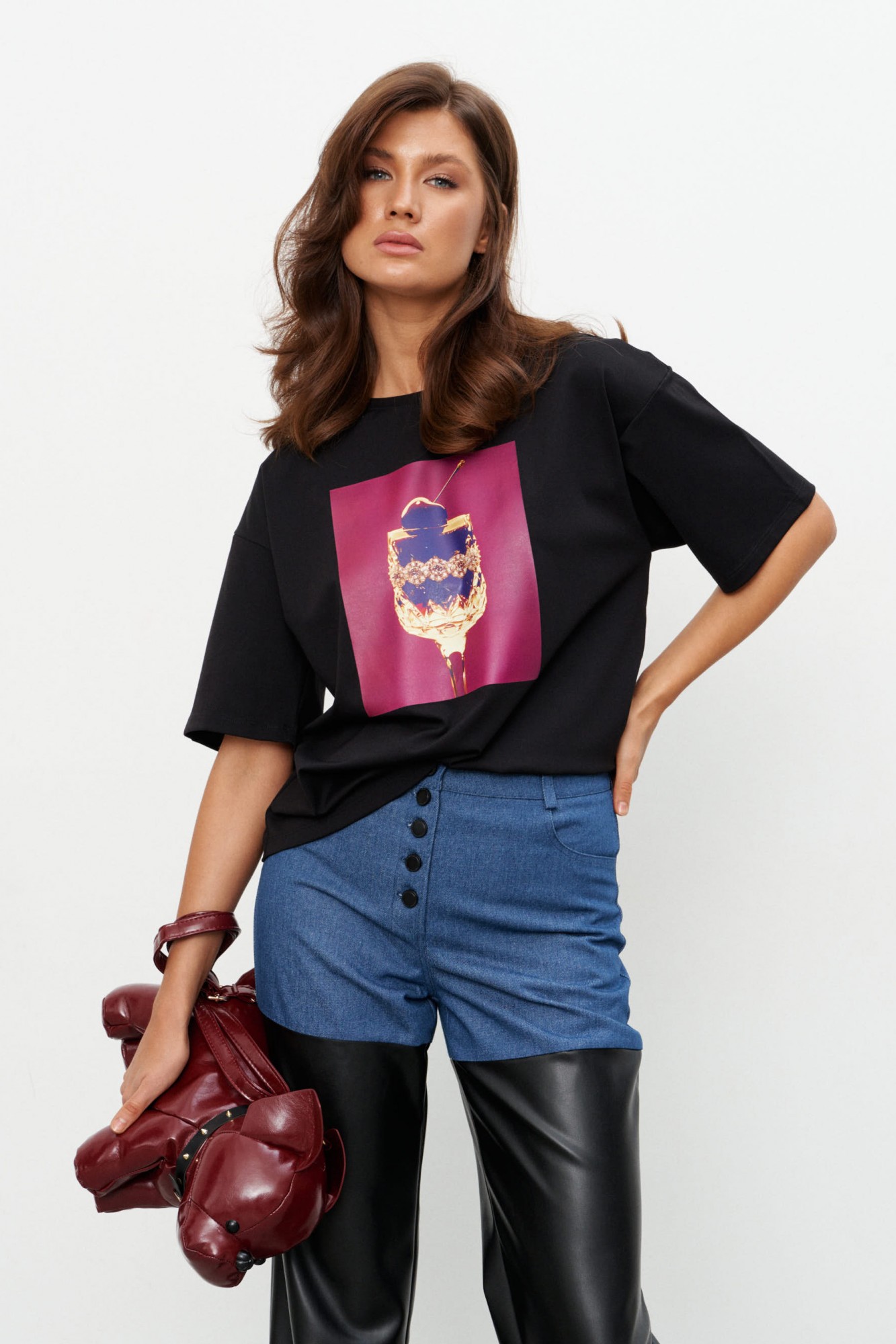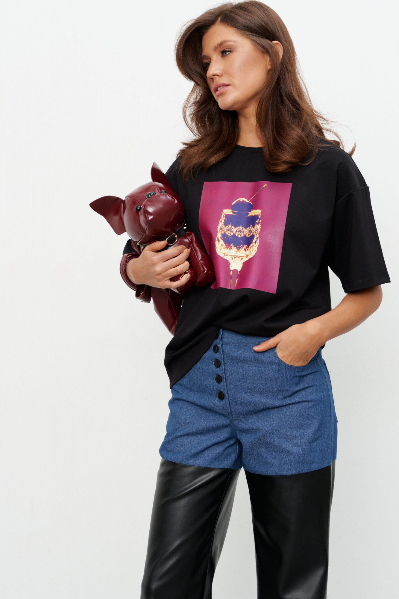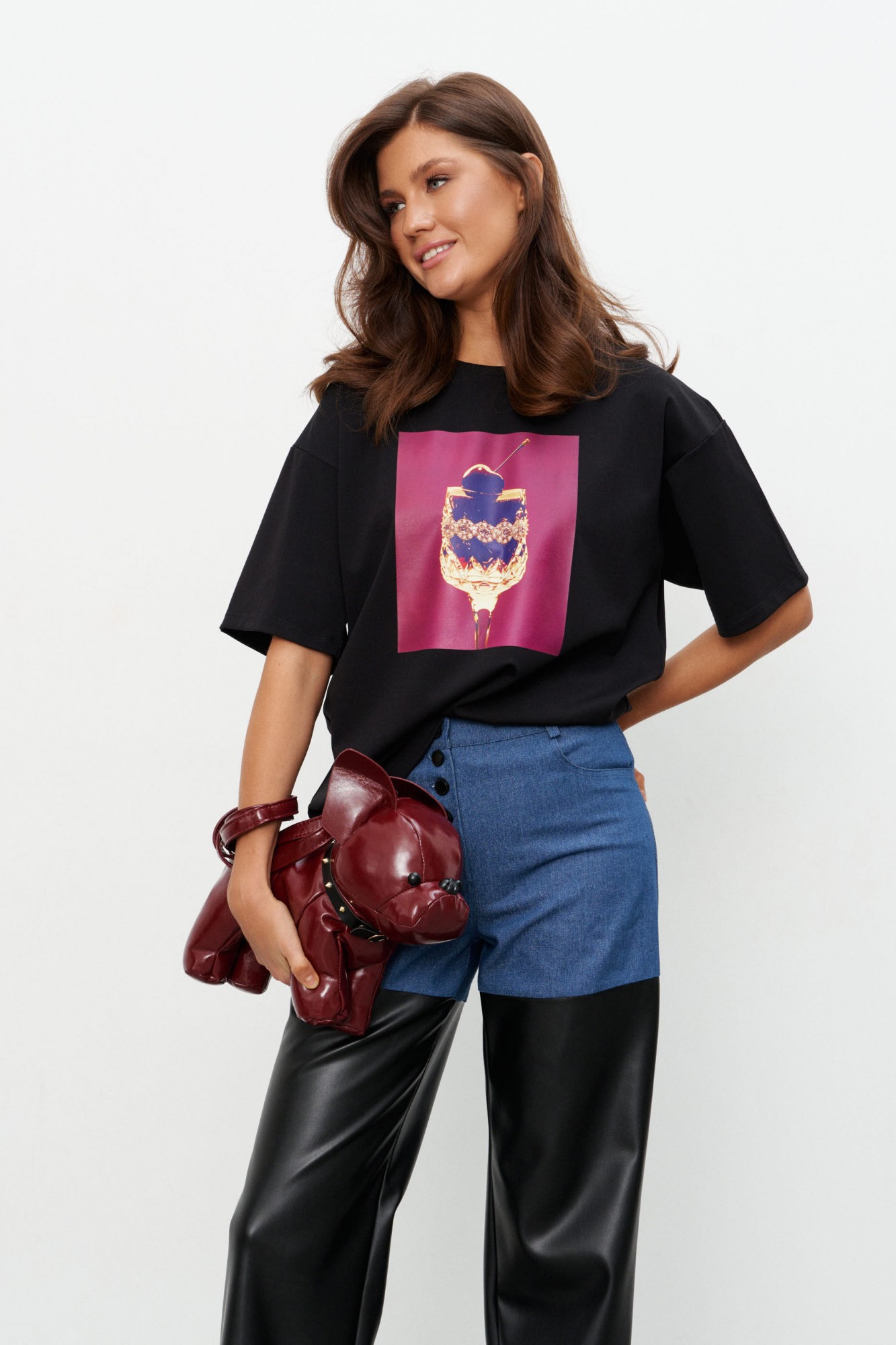 Оверсайз футболка из плотного трикотажа с контрастным принтом «Карл». Линия плеча спущена, горловина отделана эластичной бейкой.