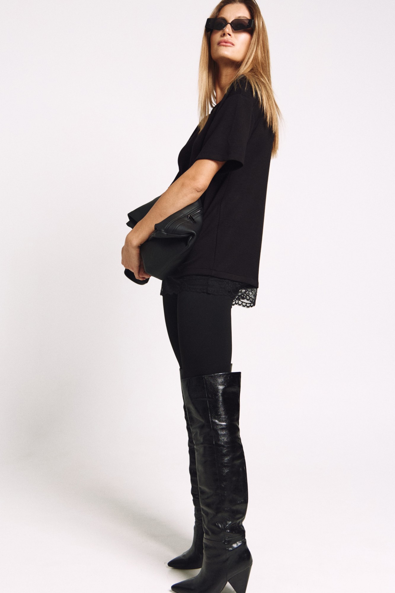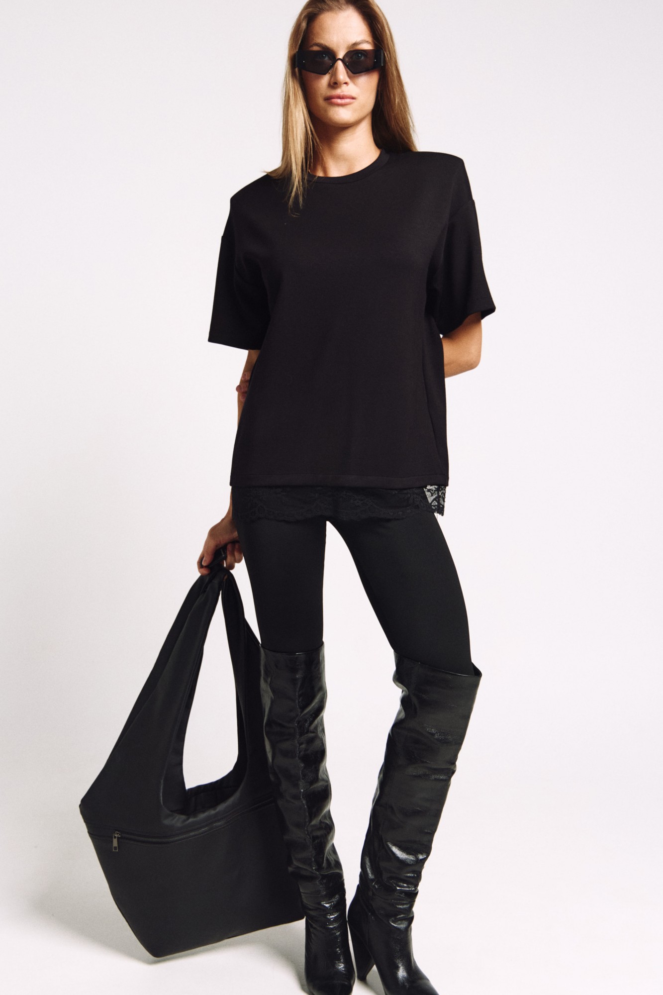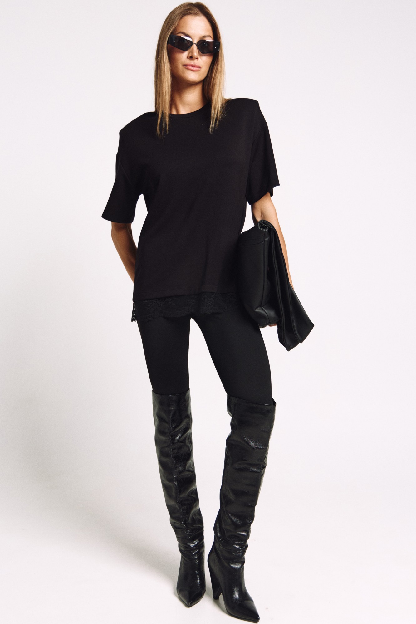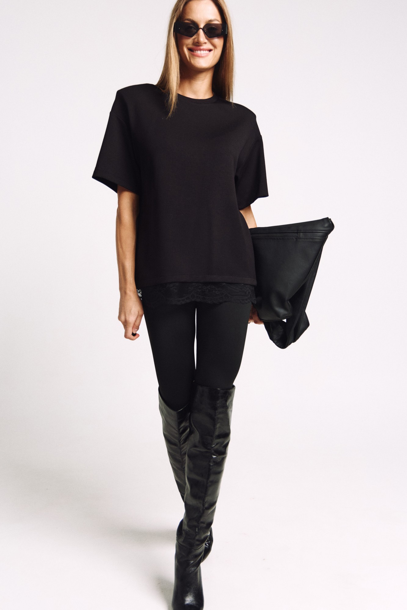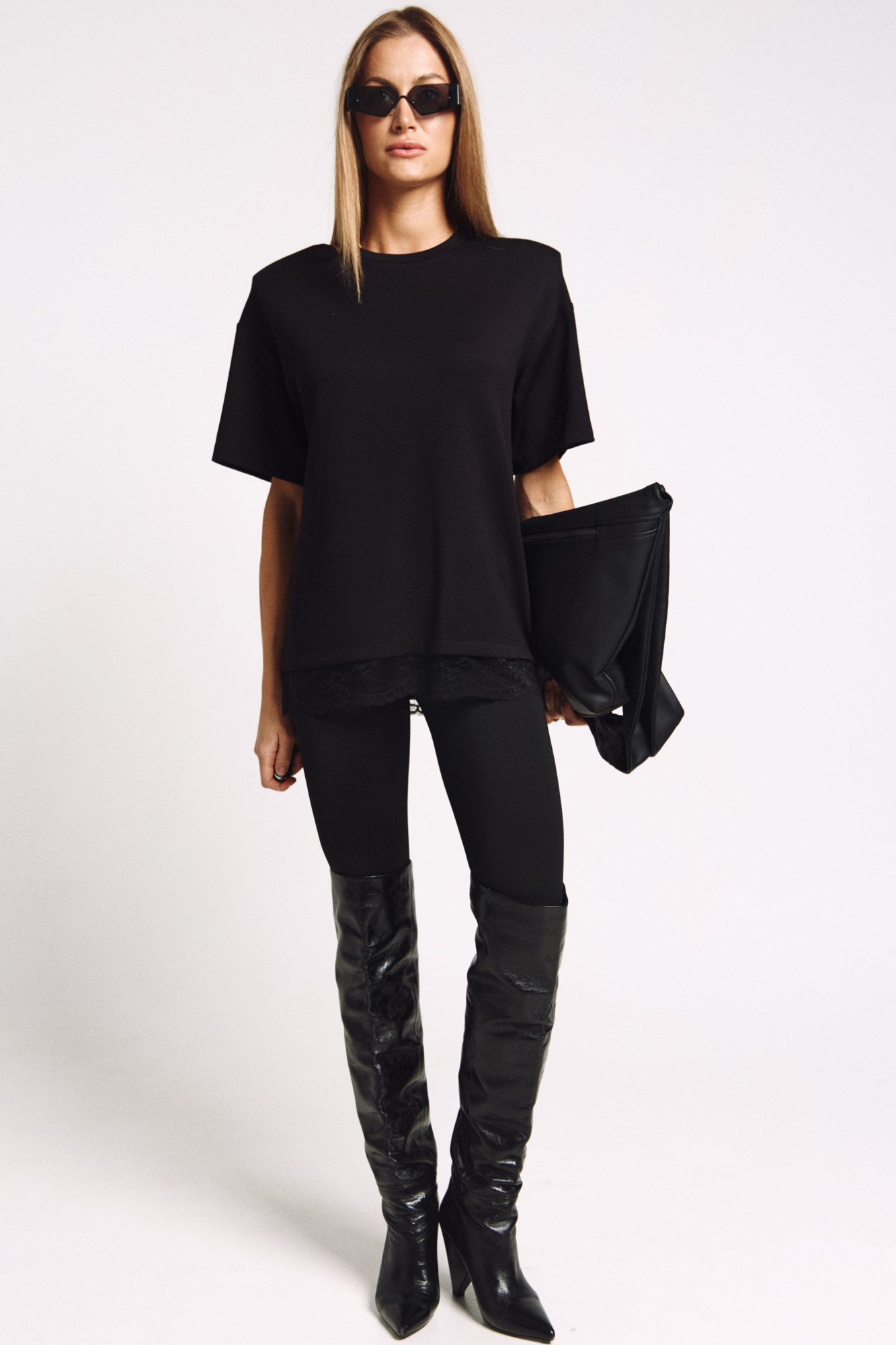 Футболка женская, удлиненная, из плотного трикотажа, с декоративными плечами и французским кружевом по низу. Два универсальных размера - S (соответствует 42-44-46), L (соответствует 48-50-52).