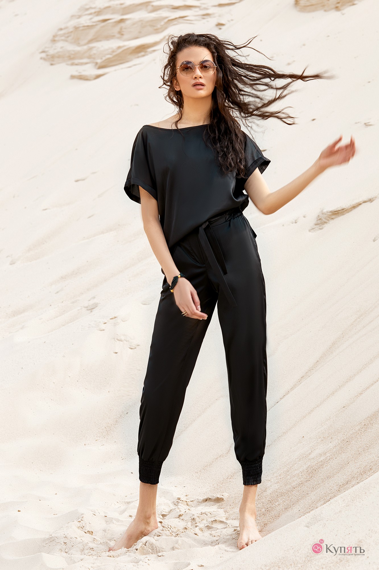 Блуза свободного силуэта со спущенным коротким рукавом. Вырез горловины – «лодочка». Рукав цельнокроеный с отворотом.