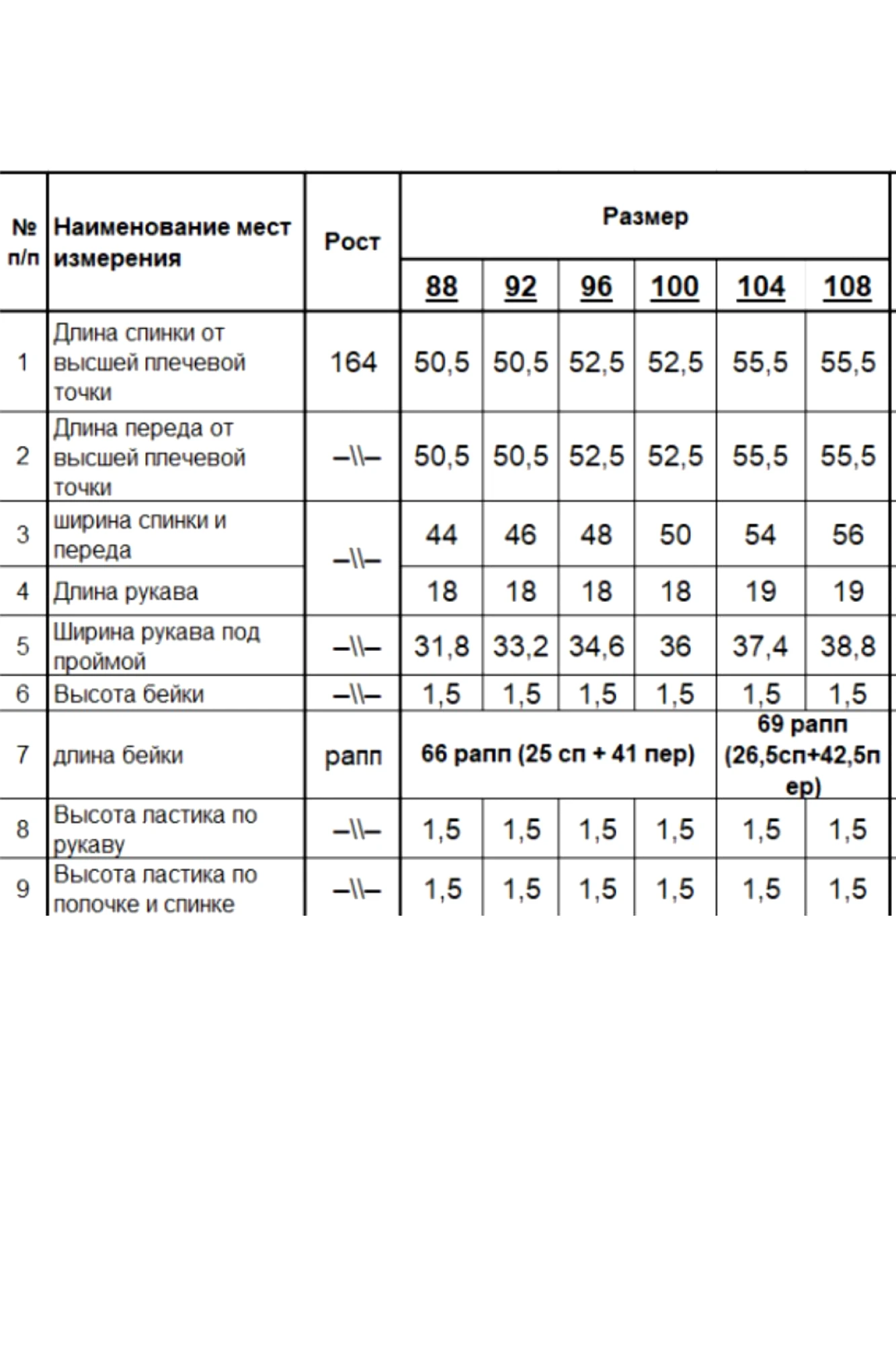 Таблица размеров