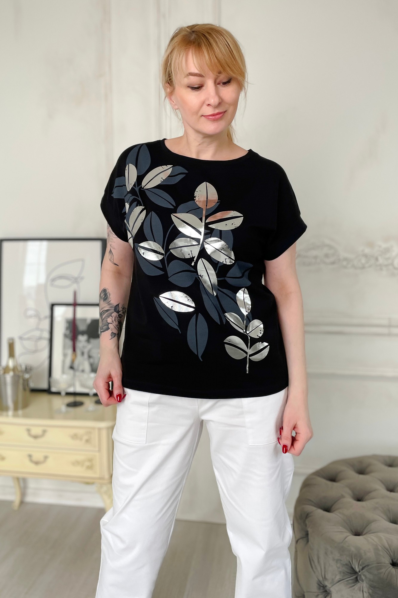 Майка из хлопковой трикотажной ткани прямого силуэта. По переду расположен принт. Спинка со средним швом. Спущенное плечо обработанное манжетой. Вырез горловины-круглый, обработан бейкой.
