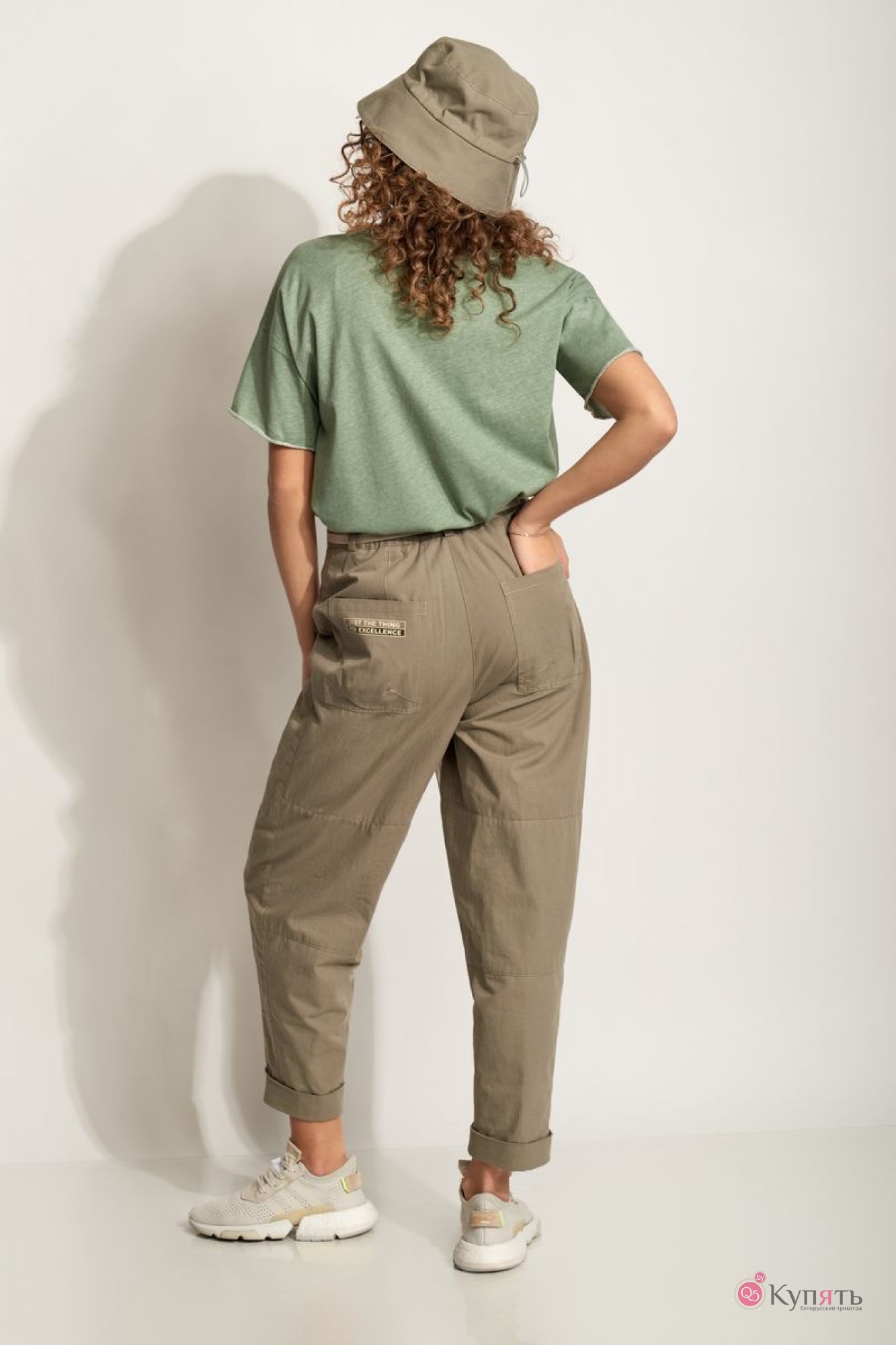 Футболка из хлопкового трикотажного полотна. Прямого силуэта, плечо спущенное. Горловина и низ рукавов обработаны бейкой с открытым срезом. Низ рукава с открытым срезом. На фото представлены брюки мод. 7257-2