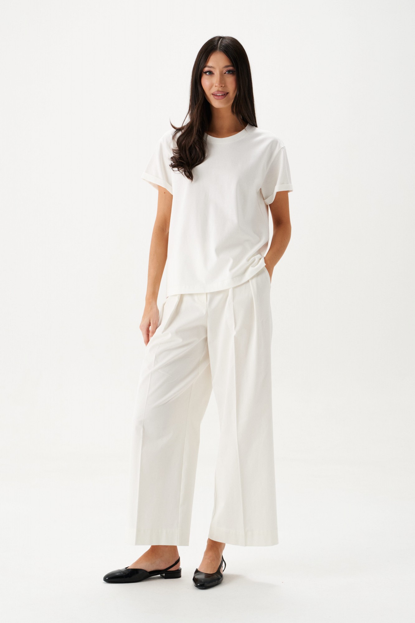 Футболка прямого кроя, выполнена из плотна белого цвета. Характеристики: прямой крой, овальный вырез горловины, горловина выполнена из довяза, рукав слегка спущен, край рукава подвернут, спереди пришит фирменный лого.