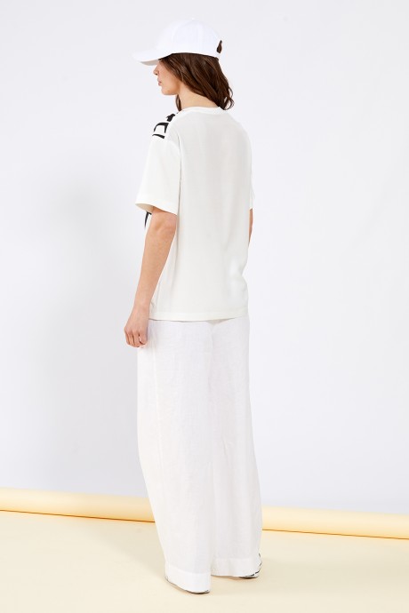 Футболка летняя, прямого силуэта, с втачным коротким рукавом. Выполнена из вискозного трикотажного и текстильного полотна. Полочка с принтом. Горловина футболки с планкой.