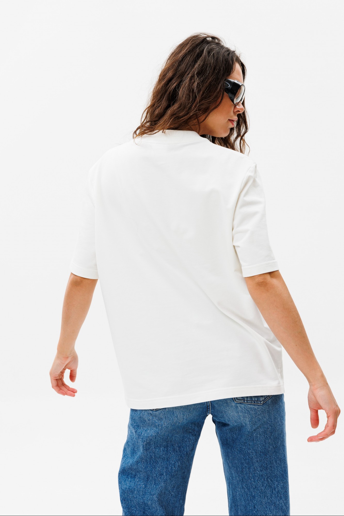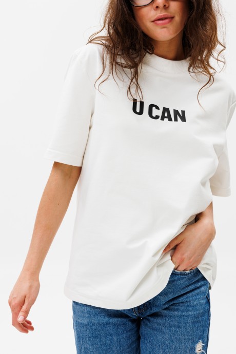 Футболка выполнена из хлопкового трикотажа, благодаря чему очень приятна к телу. Изделие универсального прямого силуэта свободного кроя. Благодаря прямому крою футболка отлично подходит разным типам фигур, хорошо сидит и не стесняет движений. Вырез горловины круглый с притачной планкой, низ футболки и рукава подгибка, закрепленная распошивочным швом. По переду и спинке футболка декорирована принтом «U CAN».
