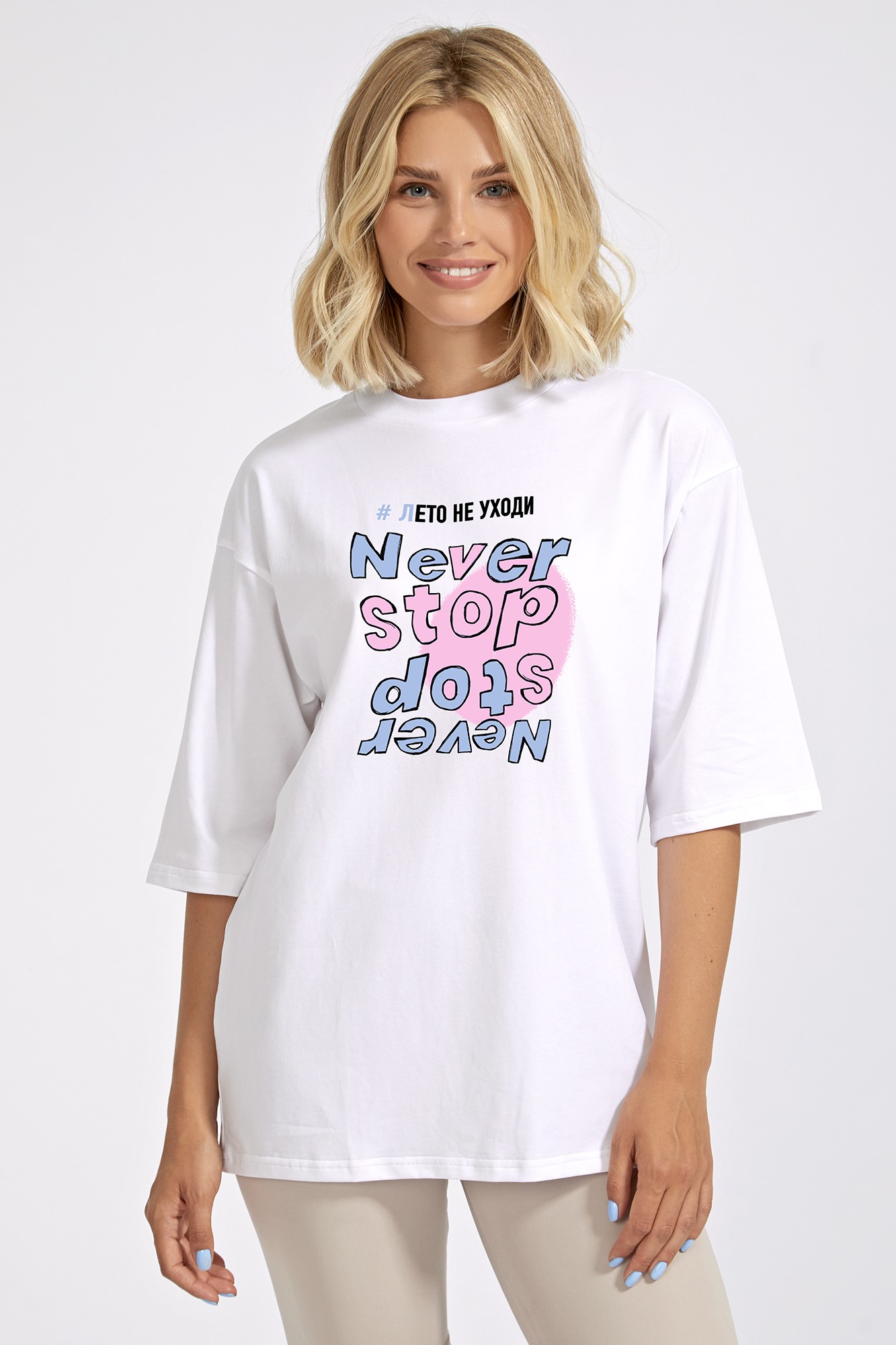 Классическая футболка из нежного хлопка прямого силуэта. Свободный крой oversize. Рукав чуть ниже локтя. Рекомендуется носить, подвернув один или два раза.