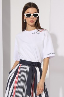 Футболка свободной формы, покроя спущенное плечо, выполнена из х/б трикотажного полотна. Горловина округлой формы, обработана планкой. Рукав одношовный, до уровня локтя. На детали переда и на левом рукаве расположены тематические вышивки, выполненные нитками контрастного цвета.