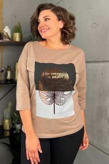 Джемпер из трикотажной хлопковой ткани, со спущенным плечом. Перед футболки с принтом. Вырез горловины круглый, оформлен бейкой. Спинка со средним швом.