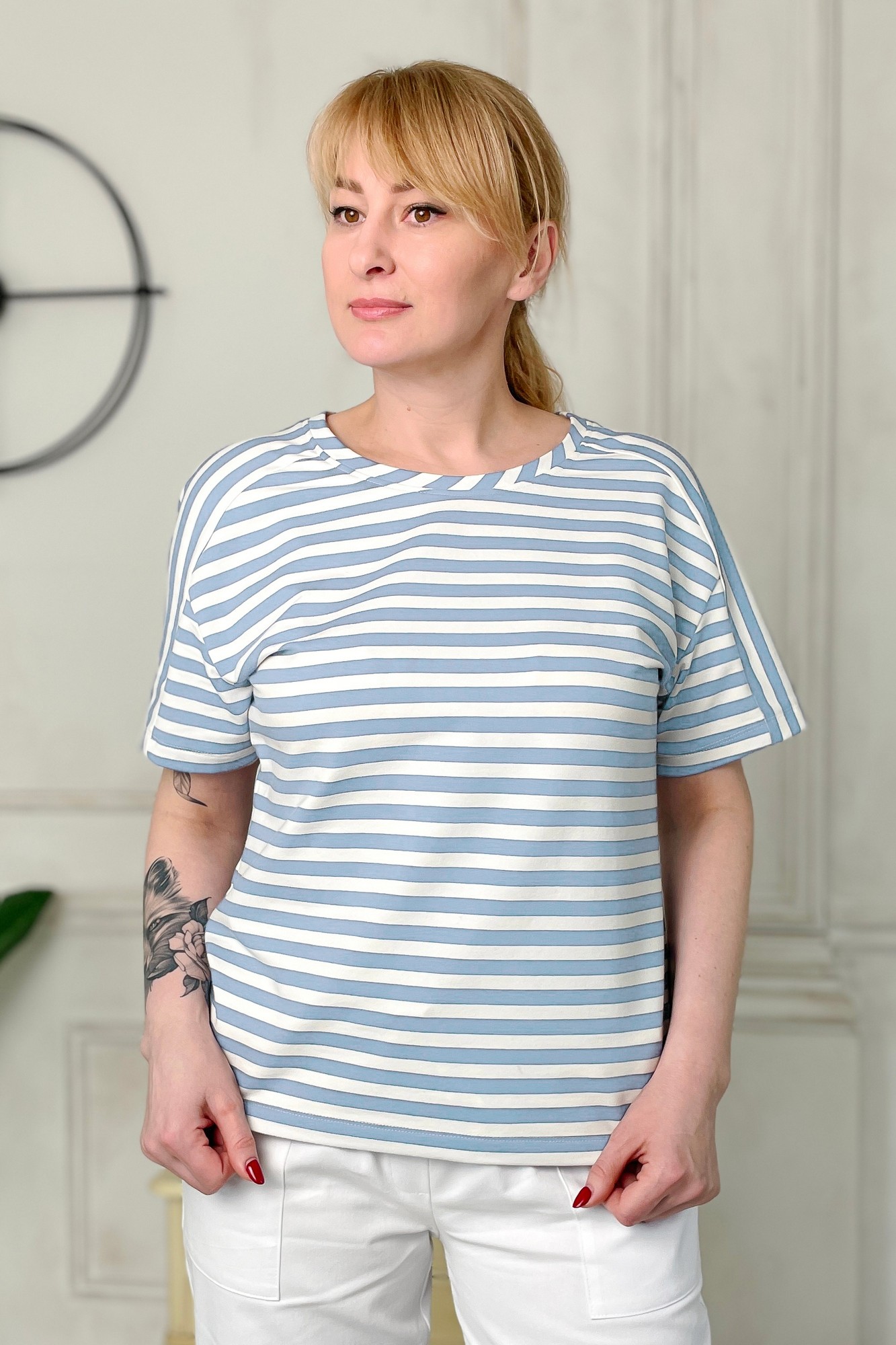 Джемпер женский из трикотажной ткани (двунитка). Красивая вязка в полоску. По плечу джемпера расположен декоративный подрез. Спинка прямая, рукав короткий. Вырез горловины круглый, обработан притачной бейкой.