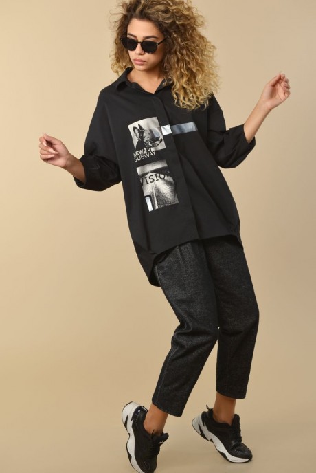 Блузка женская из хлопковой ткани свободного силуэта. Центральная застежка на потайную планку. По полочке декоративная печать. Воротник рубашечный. Плечо спущенное, рукав внизу со складками. По переду по низу складки.