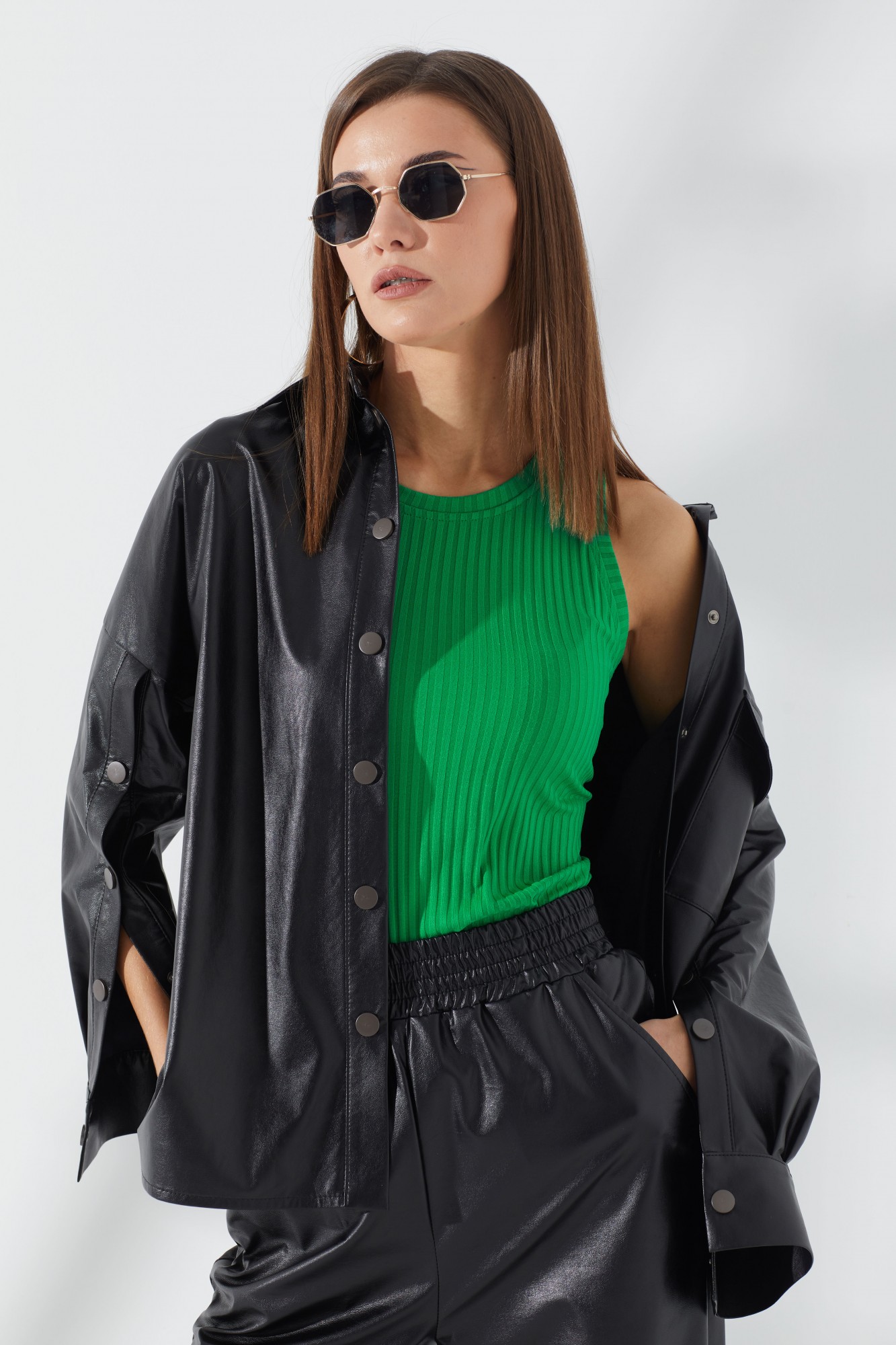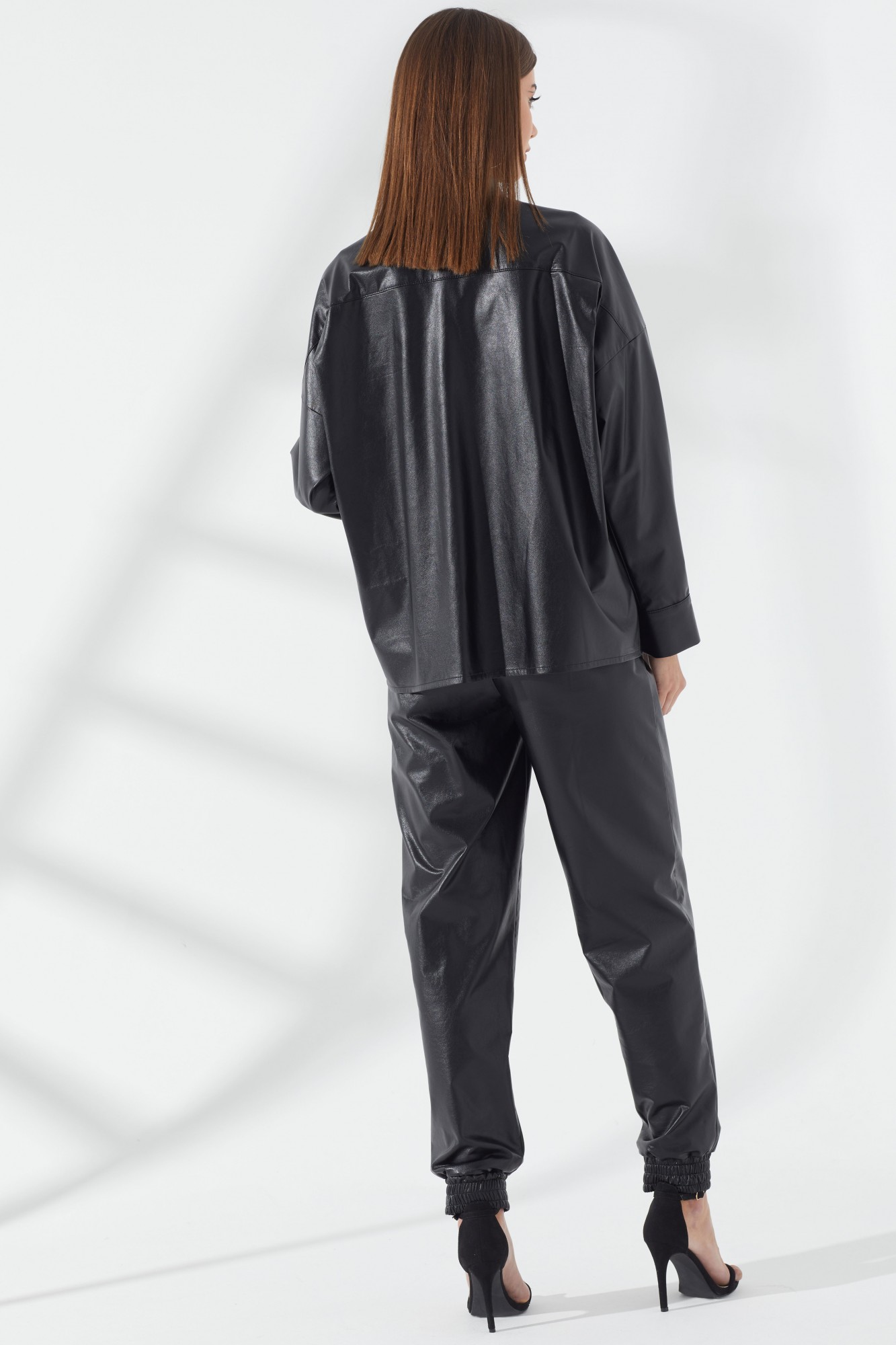 Стильная блузка свободного силуэта из экокожи на хлопковой основе. Воротник рубашечного типа с застежкой на кнопки. Рукав со спущенной линией плеча, с застежкой на кнопки. На правой половинке переда функциональный карман с клапаном.