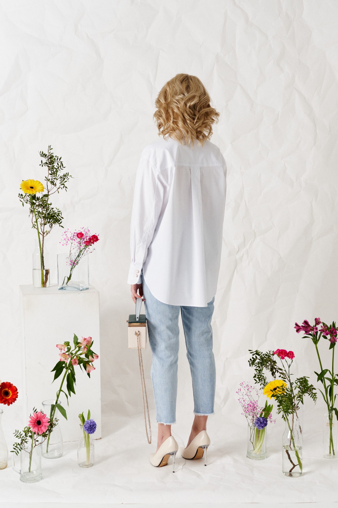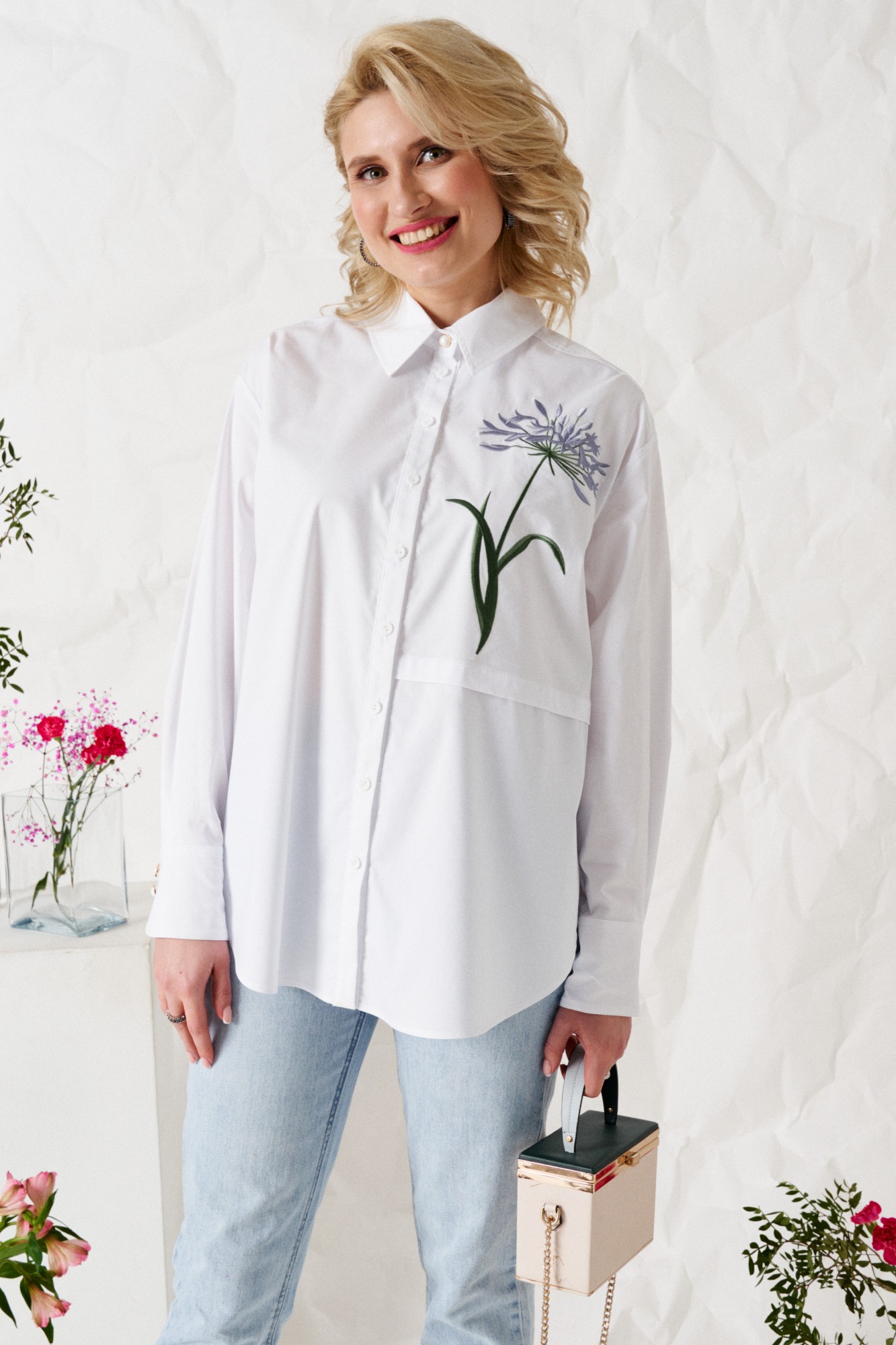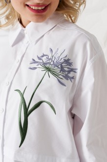 Блузка выполнена из хлопковой ткани. Блузка прямого кроя, что идеально подходит для разного типа фигуры. Застежка на сквозные петли и пуговицы. На манжете и стойке красивые жемчужные пуговицы. По боковому имеется небольшой округлый разрез. Главные акцентом является нежная вышивка в виде “цветущего одуванчика”.