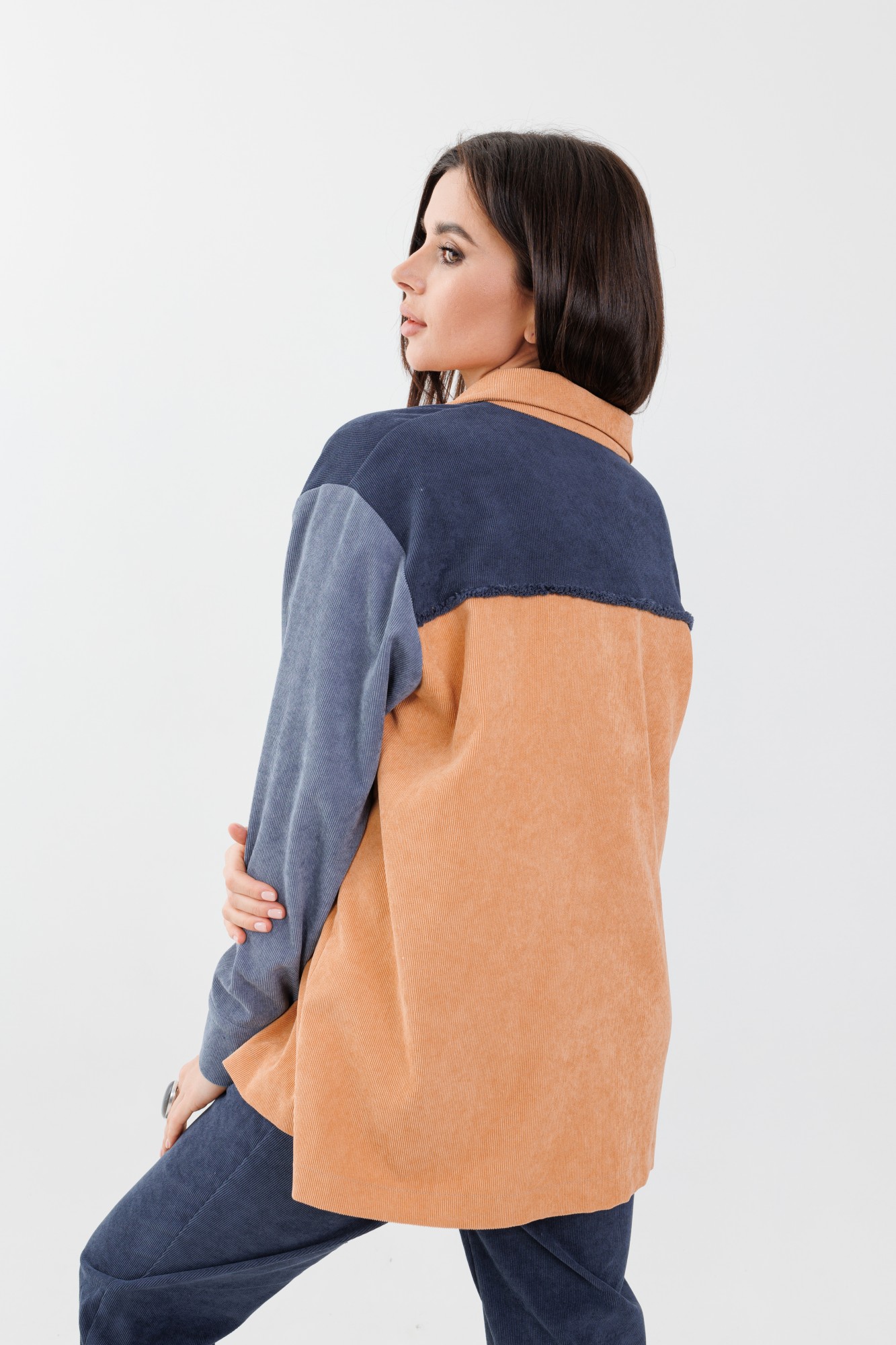 Рубашка прямого силуэта в стиле пэчворк, длина до середины бедра. По спинке кокетка декорированная бахромой.