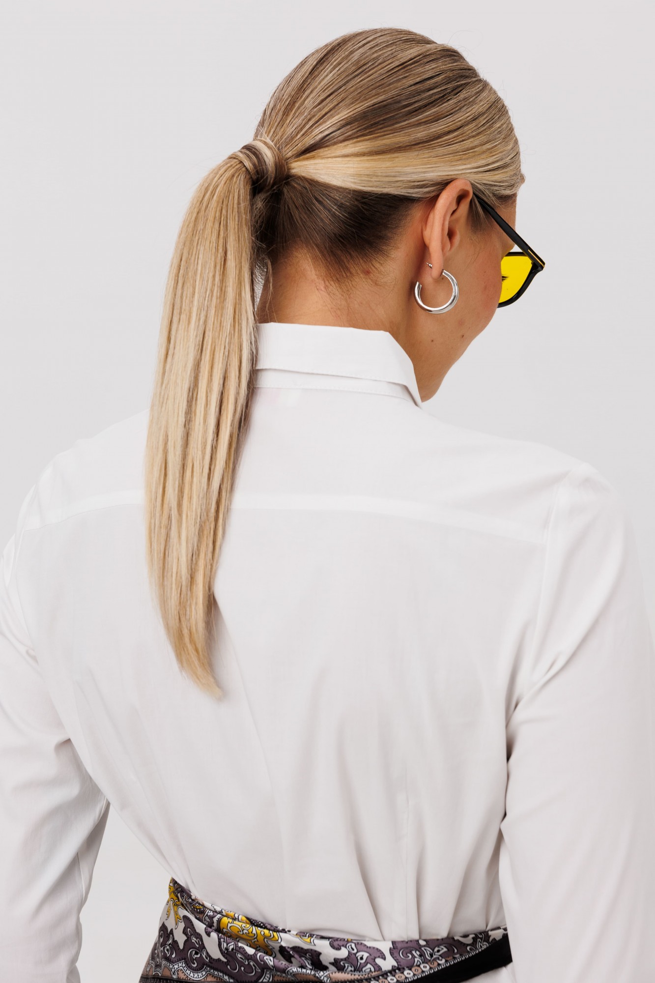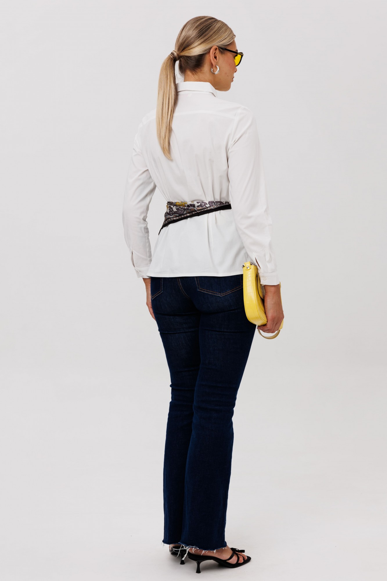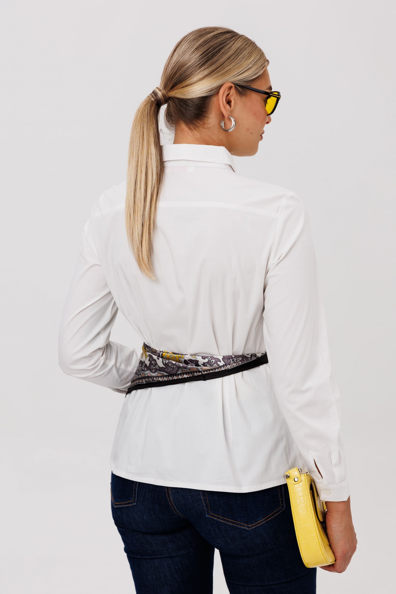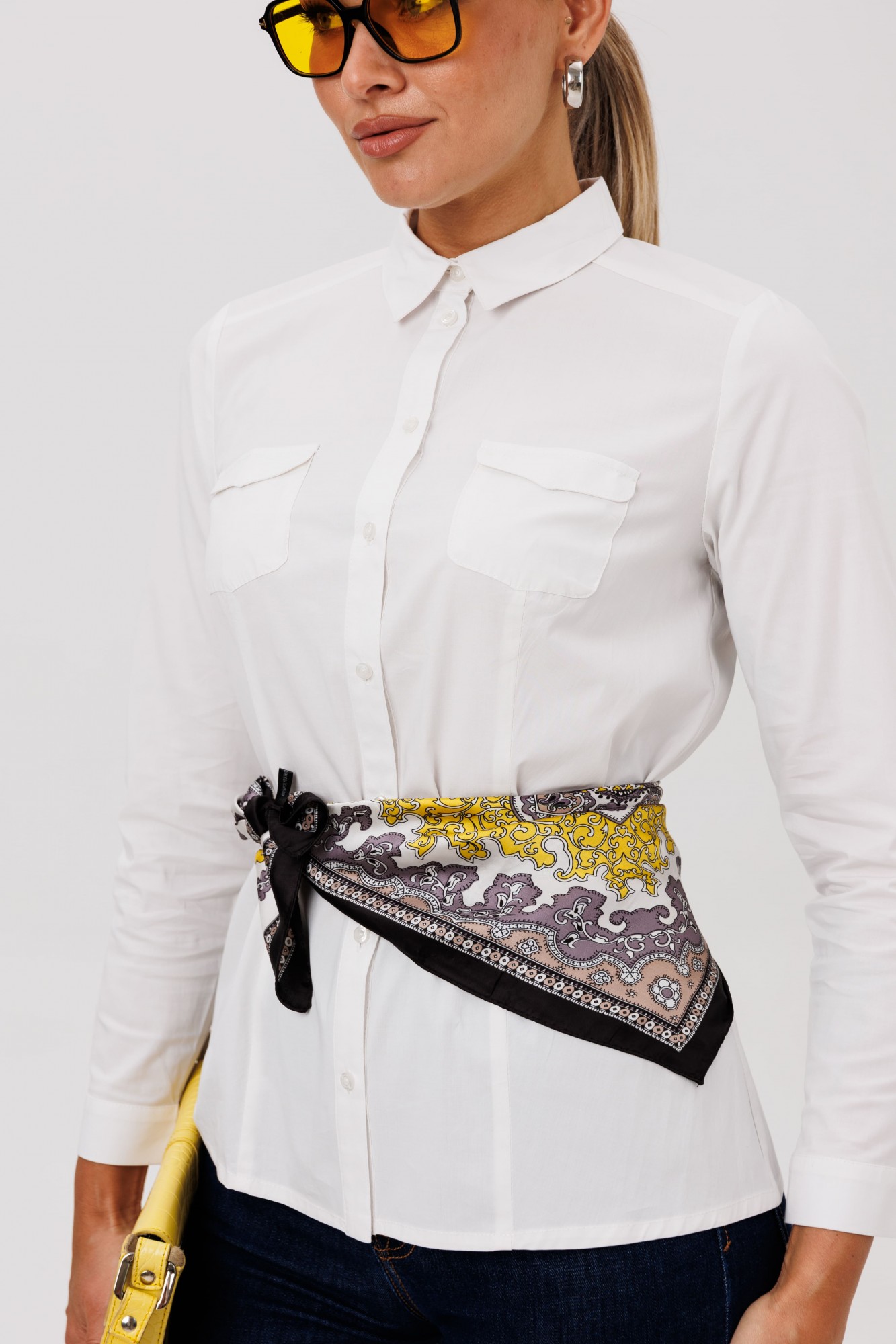 Классическая блуза отличается строгим и лаконичным дизайном. Ее передняя часть оформлена нагрудными вытачками, идущими от низа, и дополнена накладными карманами с закругленными краями. Спинка модели имеет талевые вытачки и цельнокроеную кокетку, которая плавно переходит на полочку, обеспечивая идеальную посадку по фигуре.