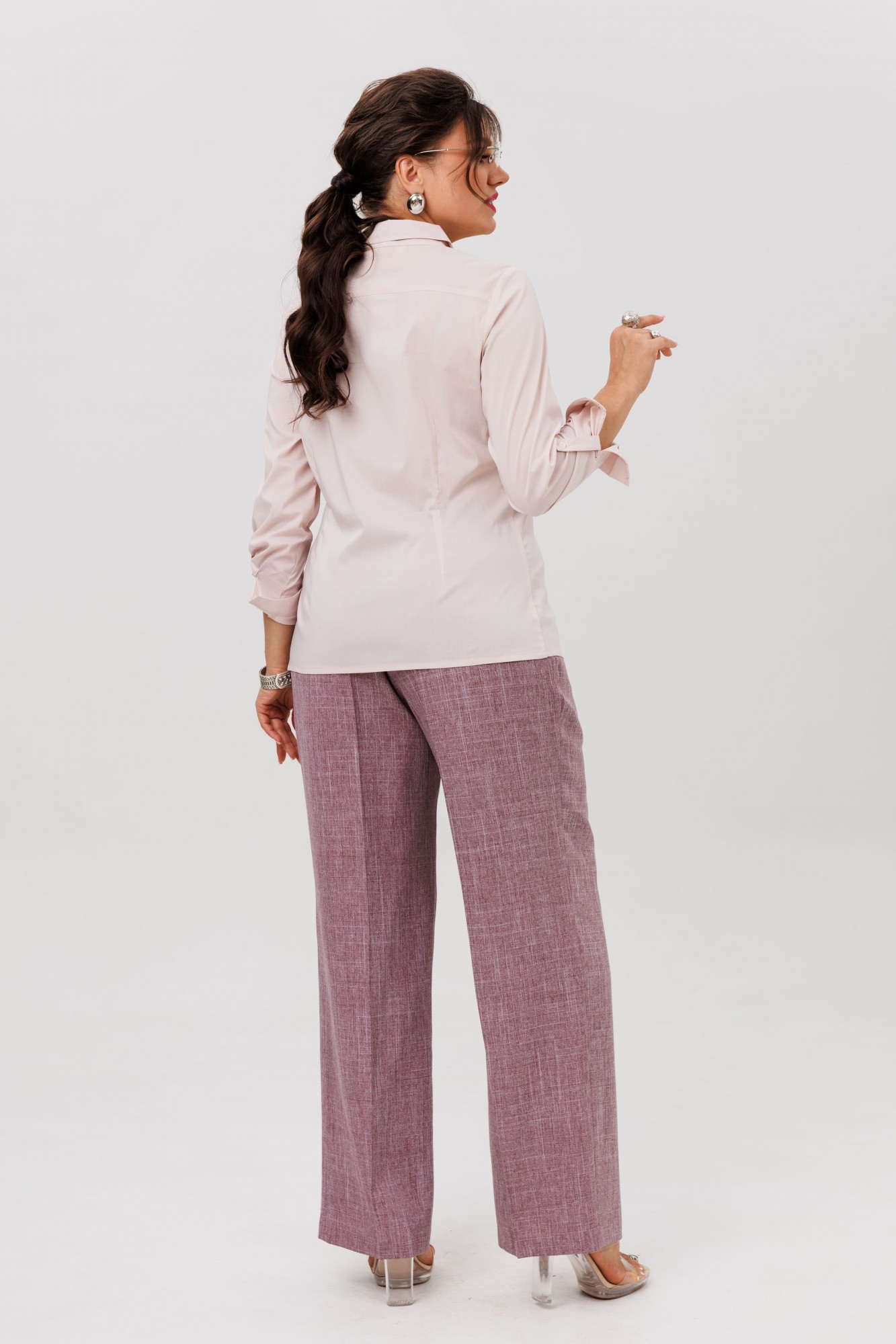 Блузка застегивается на пуговицы по цельнокроеной планке и завершается воротником на стойке. Рукава являются втачными и заканчиваются манжетами с застежкой на пуговицу, что позволяет регулировать их ширину с помощью специальной паты. Эта модель станет универсальным элементом гардероба, подходящим для повседневной носки, учебы или соблюдения дресс-кода.