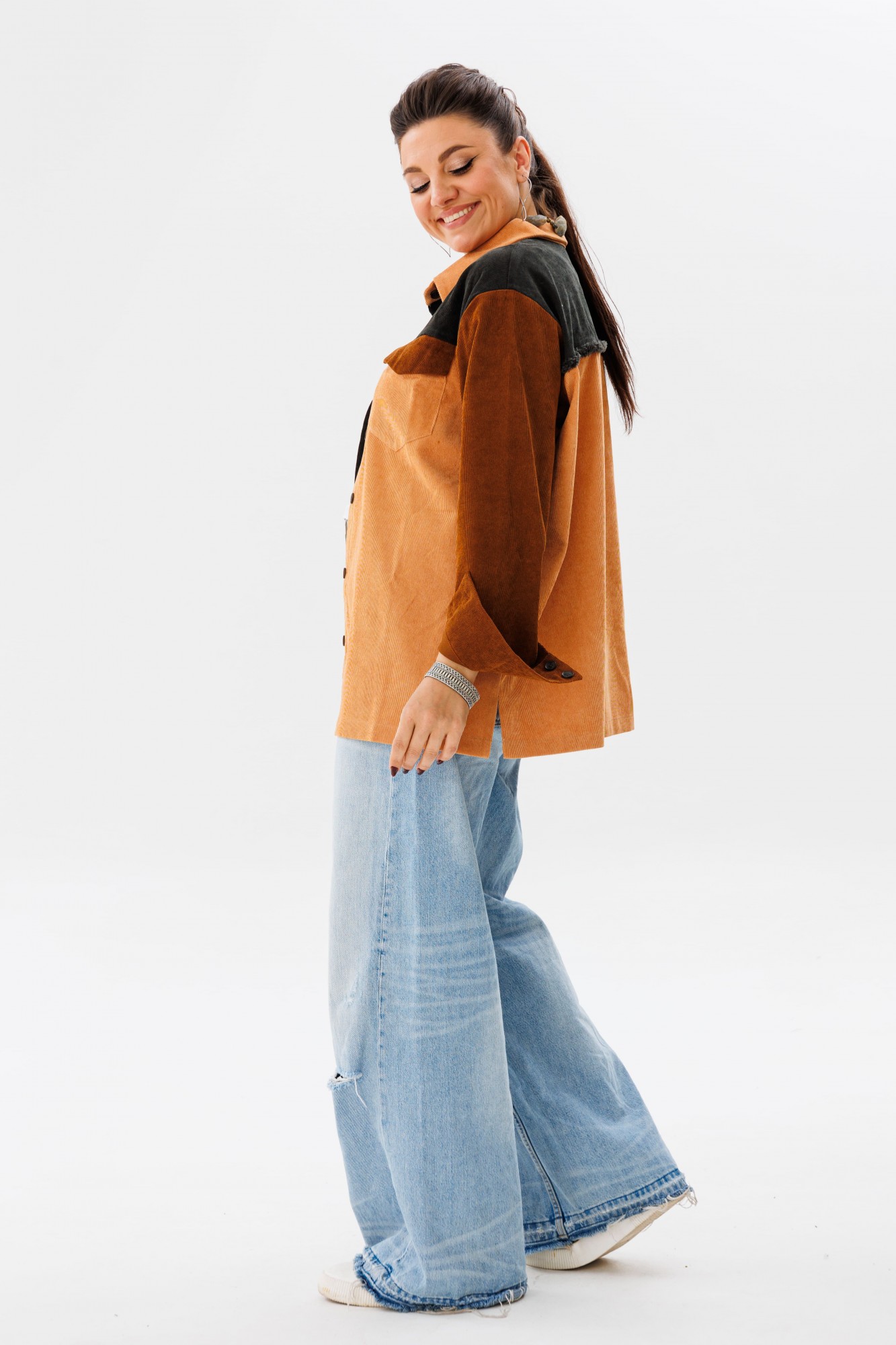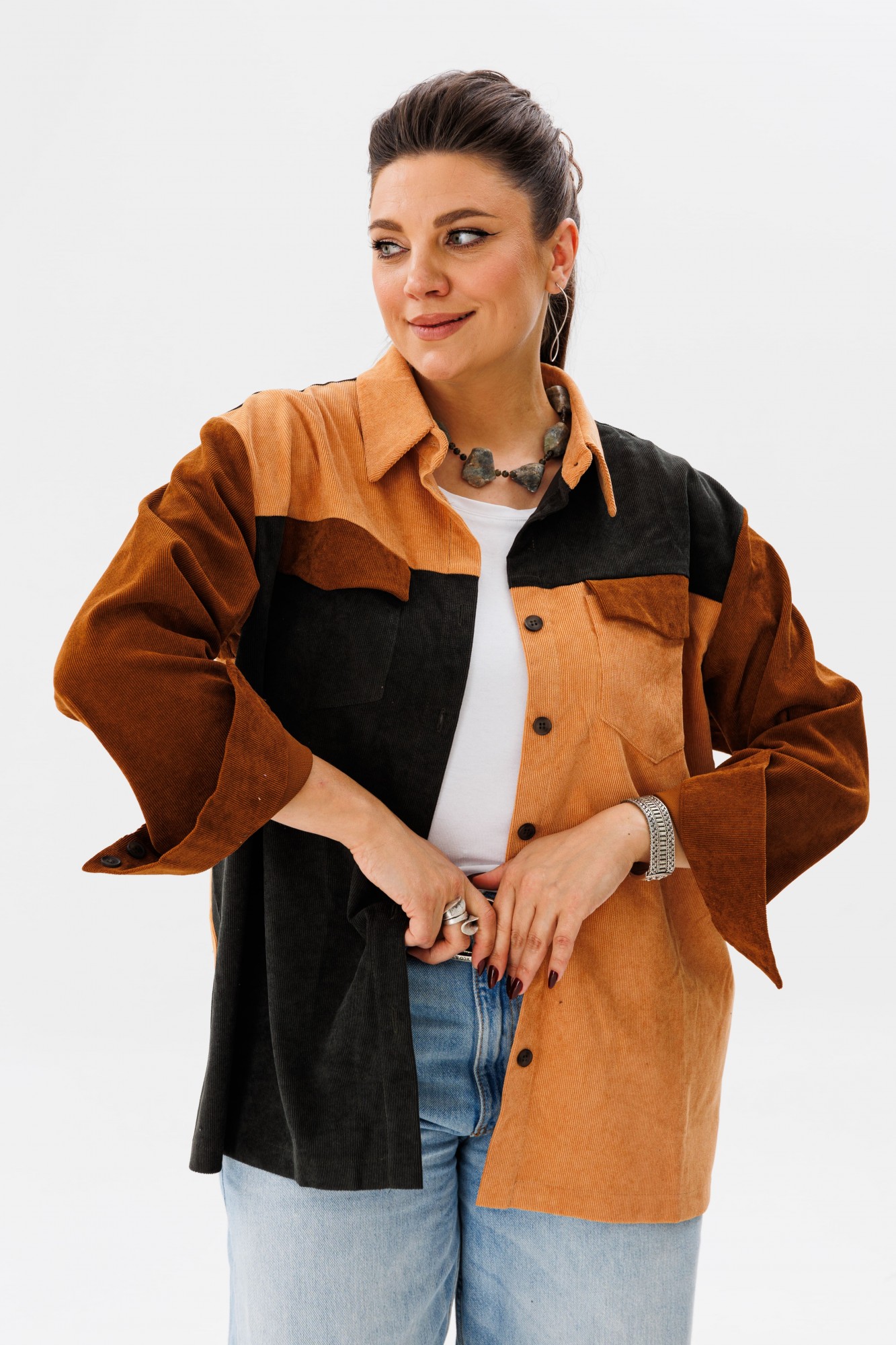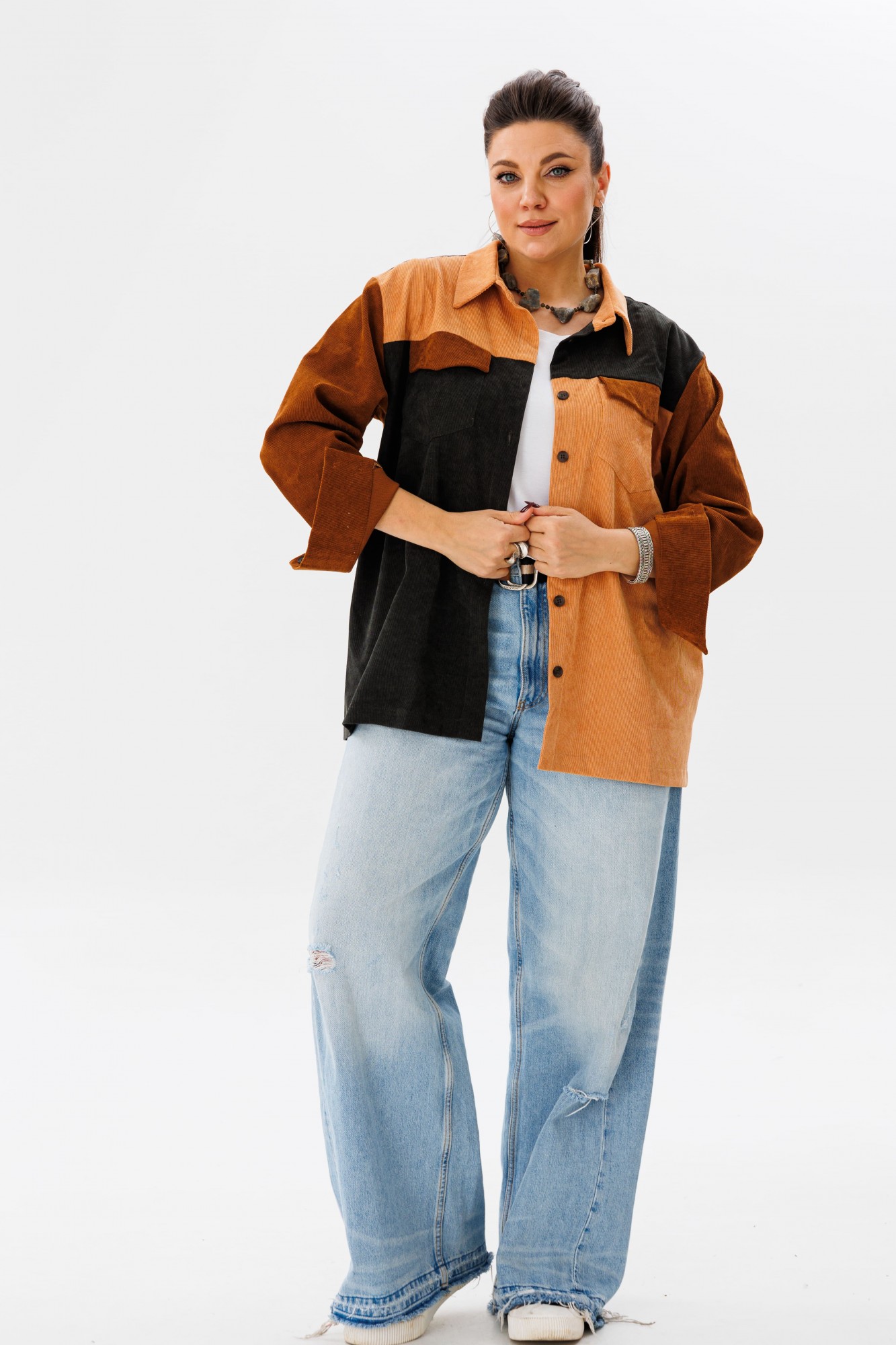 Вельветовая рубашка прямого силуэта от Анелли, сочетающая в себе сладость и мягкость оттенков карамели, – идеальное решение для тех, кто ценит стиль и уют. Отложной воротник на стойке и застёжка на пуговицы добавляют нотки строгости, а спущенное плечо с длинным втачным рукавом на манжете – удобство и практичность. Край кокетки на спинке обработан бахромой, что не может не привлекать внимания. Элементы рубашки сочетаются тремя цветами – это смелое решение, которое даёт возможность собирать образы с любыми вашими вещами! Также на модели собран образ с жилетом 1386 от Анелли.