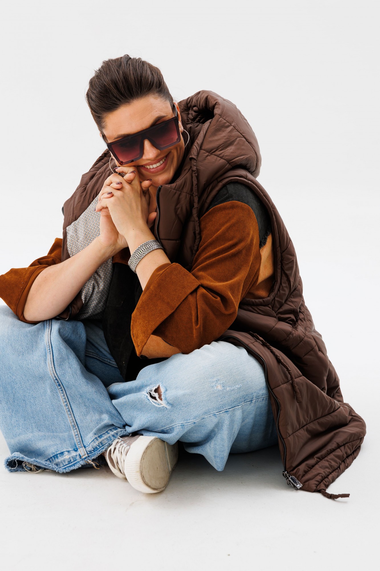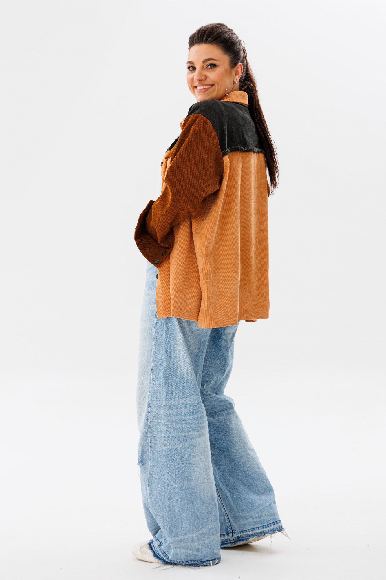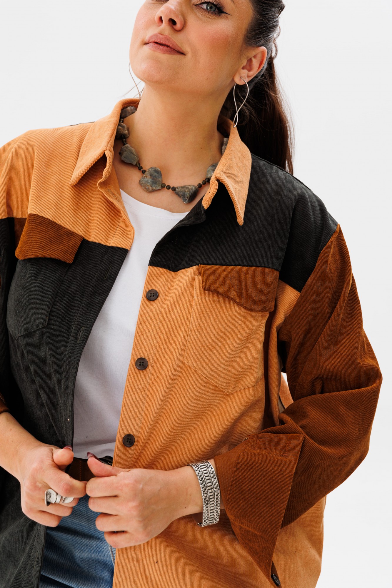 Вельветовая рубашка прямого силуэта от Анелли, сочетающая в себе сладость и мягкость оттенков карамели, – идеальное решение для тех, кто ценит стиль и уют. Отложной воротник на стойке и застёжка на пуговицы добавляют нотки строгости, а спущенное плечо с длинным втачным рукавом на манжете – удобство и практичность. Край кокетки на спинке обработан бахромой, что не может не привлекать внимания. Элементы рубашки сочетаются тремя цветами – это смелое решение, которое даёт возможность собирать образы с любыми вашими вещами! Также на модели собран образ с жилетом 1386 от Анелли.