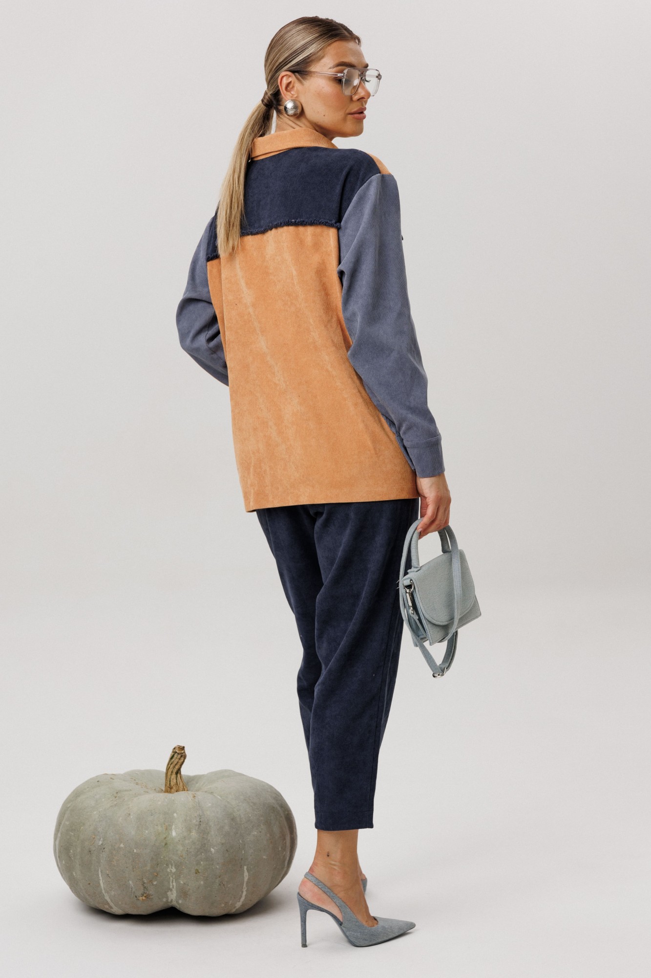 Отложной воротник на стойке и застёжка на пуговицы добавляют нотки строгости, а спущенное плечо с длинным втачным рукавом на манжете – удобство и практичность. Край кокетки на спинке обработан бахромой, что не может не привлекать внимания.