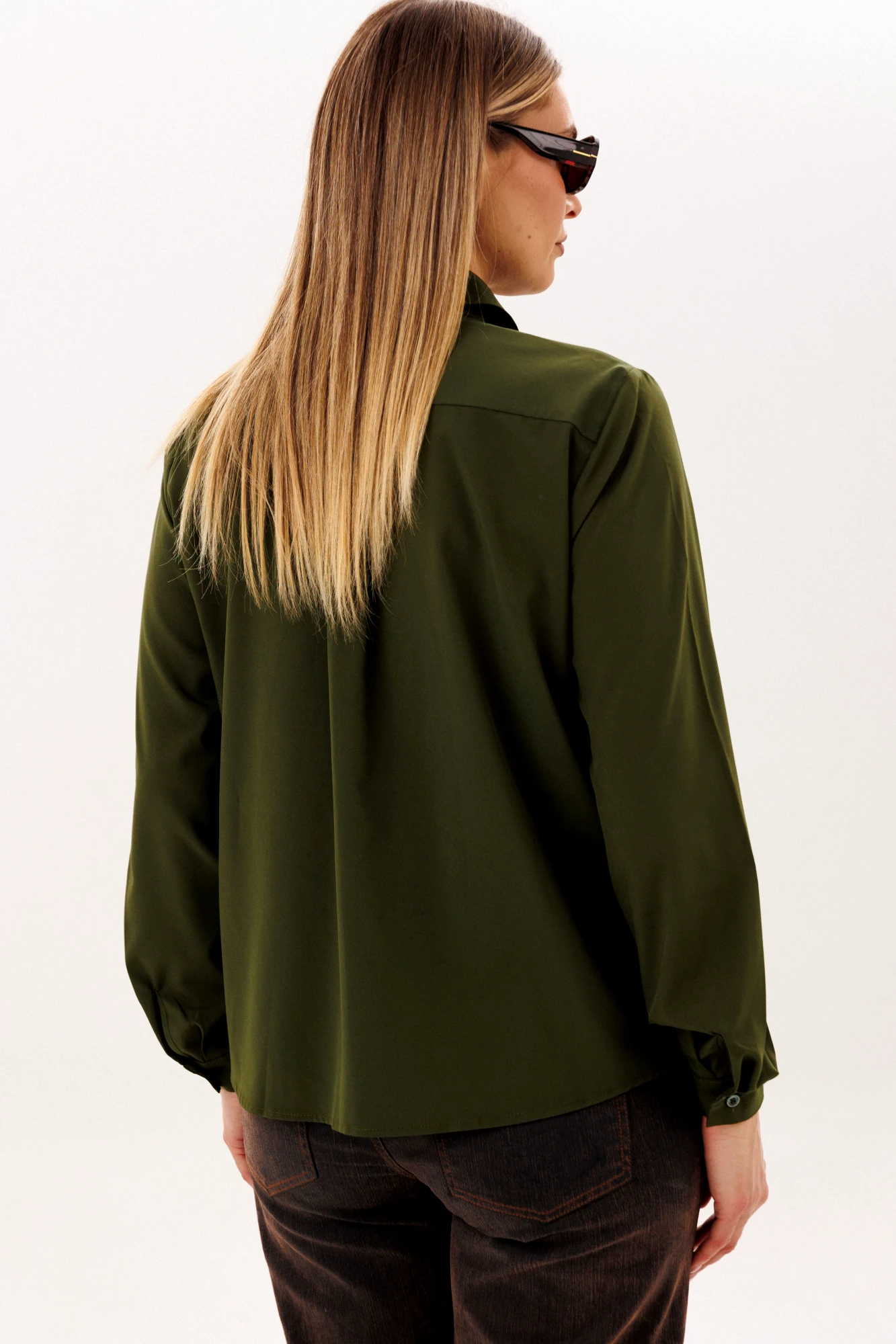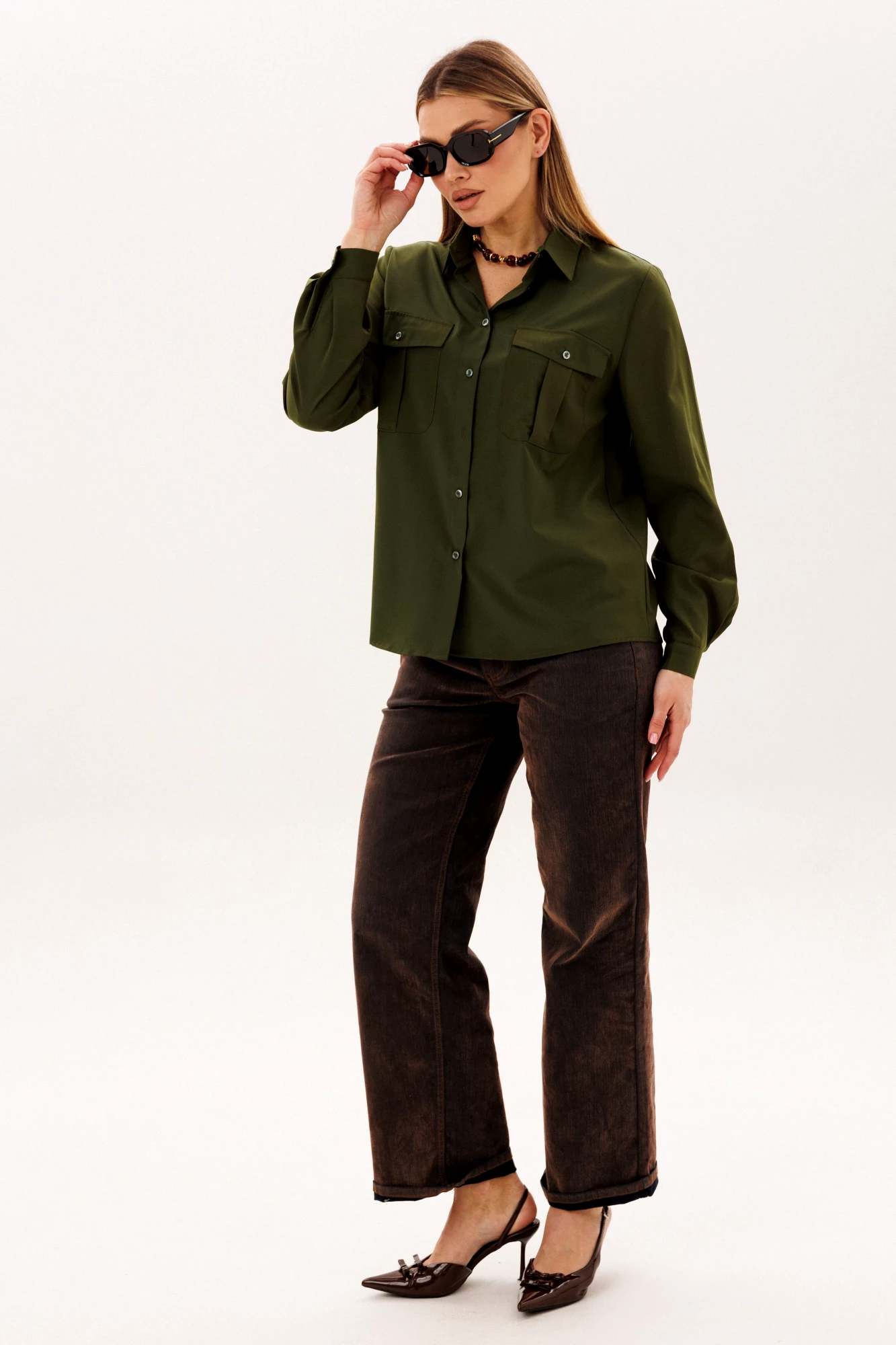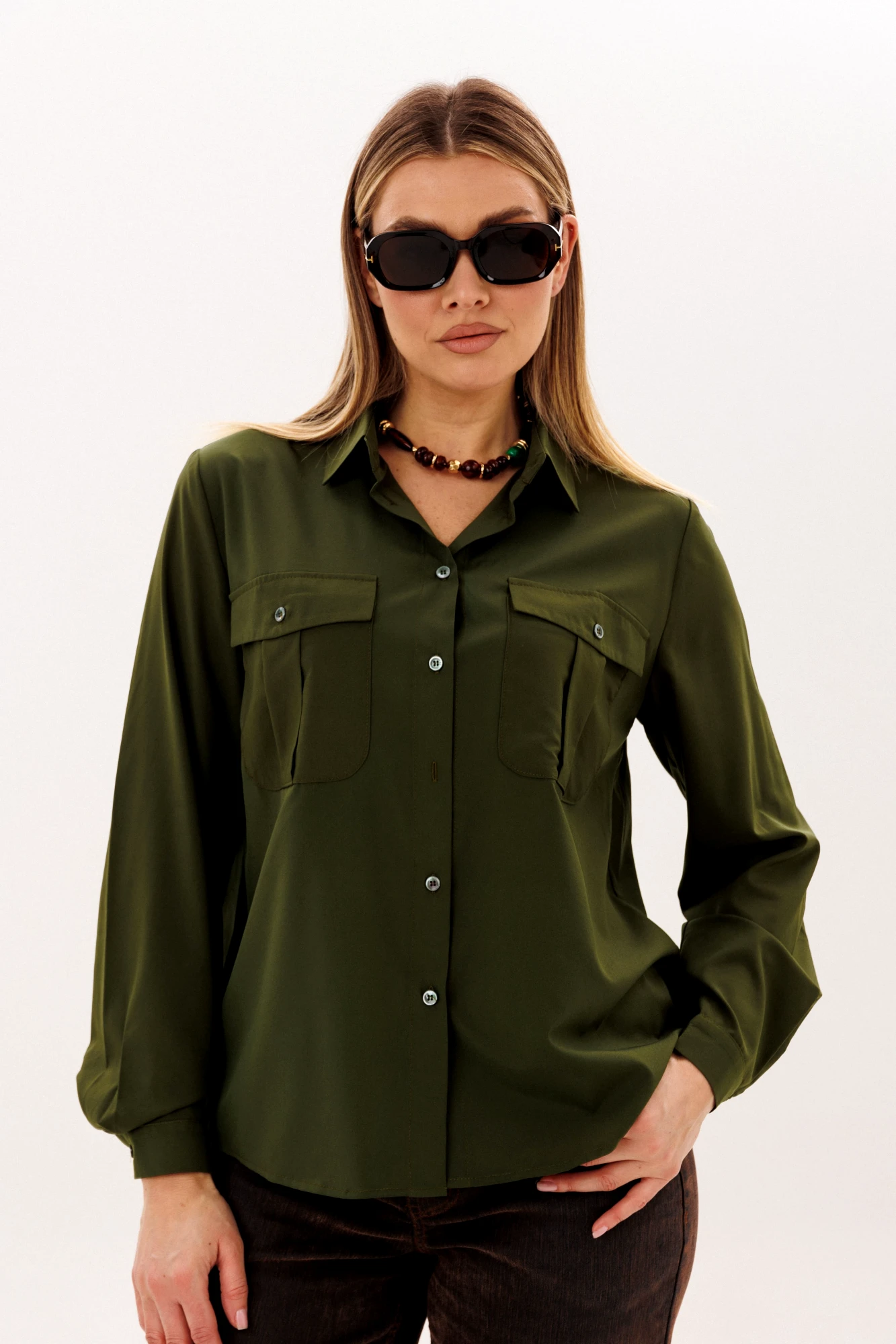 Ее свободный силуэт обретает особый шарм благодаря накладным карманам с клапанами, которые задают тон всему образу. Изысканность модели подчеркивает классический рубашечный воротник и лаконичная застежка, но главный секрет ее невероятного удобства скрыт на спине: двойная отрезная кокетка, собранная тонкой складкой, дарит совершенную свободу движений. Длинные рукава с аккуратными манжетами делают этот предмет гардероба поистине универсальным спутником, который с одинаковой легкостью дополнит как юбку-карандаш, так и строгие брюки, становясь идеальным решением для каждого дня.