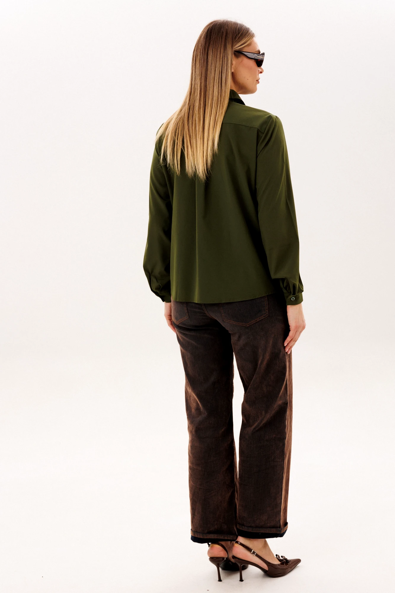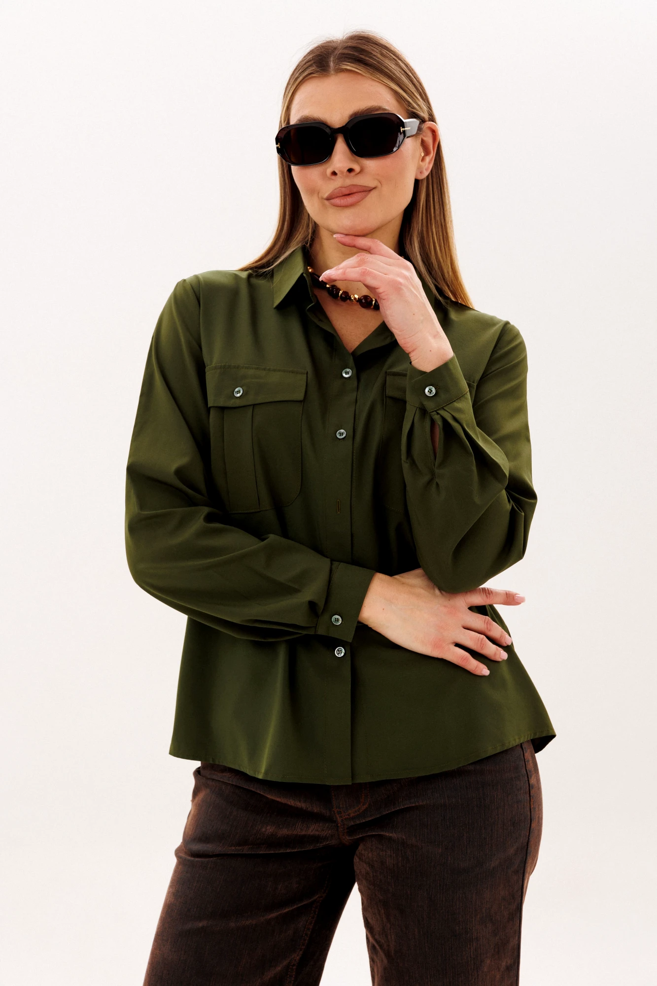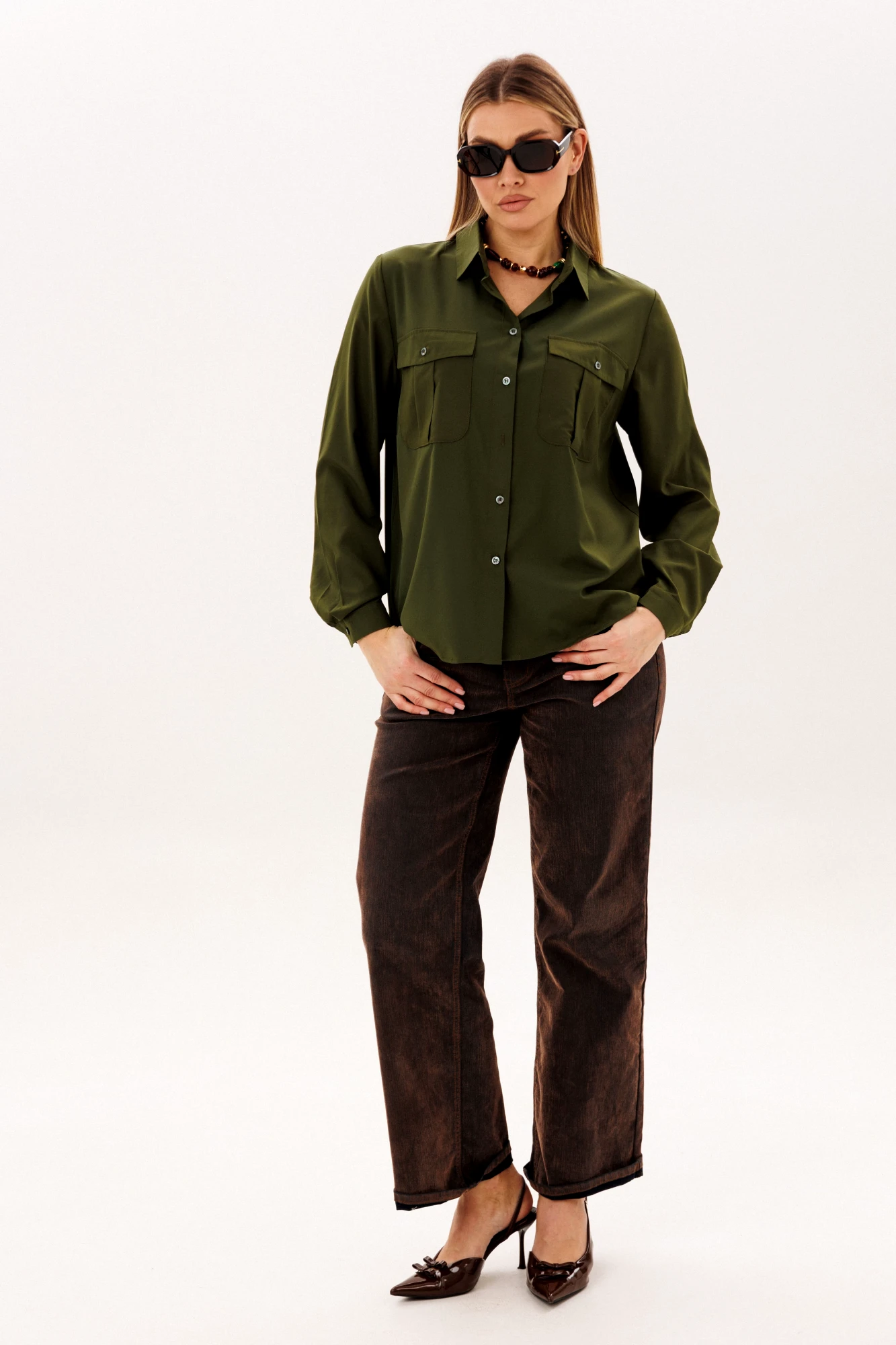 Ее свободный силуэт обретает особый шарм благодаря накладным карманам с клапанами, которые задают тон всему образу. Изысканность модели подчеркивает классический рубашечный воротник и лаконичная застежка, но главный секрет ее невероятного удобства скрыт на спине: двойная отрезная кокетка, собранная тонкой складкой, дарит совершенную свободу движений. Длинные рукава с аккуратными манжетами делают этот предмет гардероба поистине универсальным спутником, который с одинаковой легкостью дополнит как юбку-карандаш, так и строгие брюки, становясь идеальным решением для каждого дня.