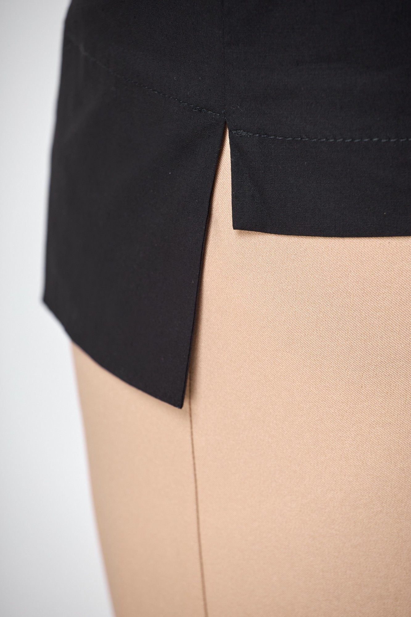 Блуза прямого силуэта, умеренного объема с асимметричной линией низа - спинка удлинённая. Рукава покроя реглан, с отрезной верхней частью, нижняя сосборена по шву притачивания верхней части и манжеты. Застежка центральная на петли и пуговицы. Воротник сорочечного типа Данная блуза прекрасно сочетается с юбками и брюками, поможет составить нескучный повседневный образ и не только.