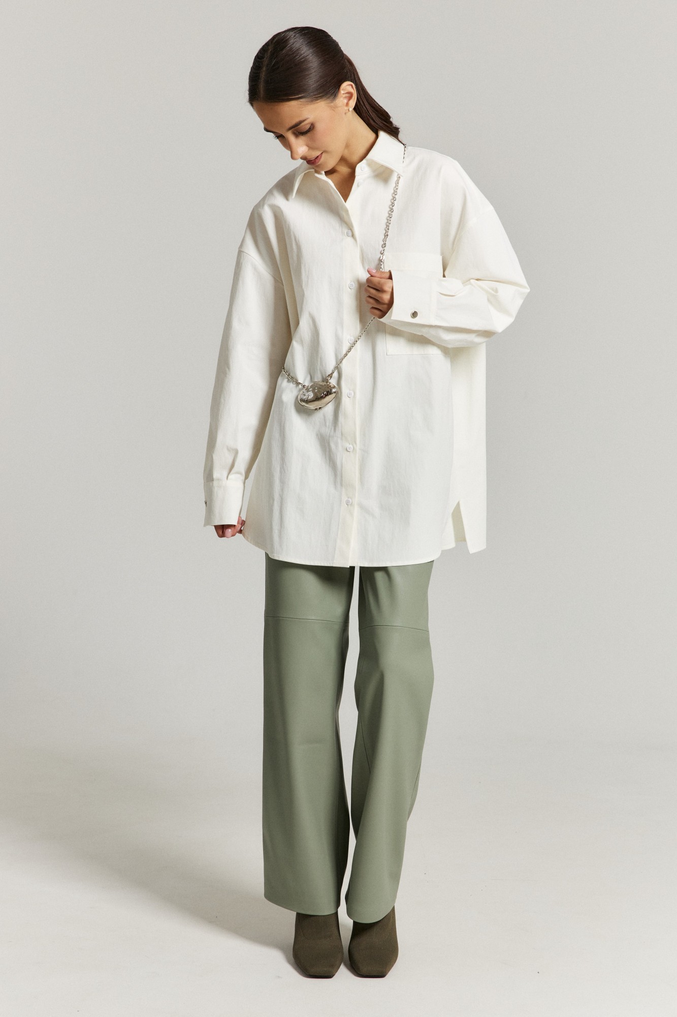 Рубашка выполнена из белой хлопковой ткани. Прямого свободного силуэта. По переду застежка на пуговицы, воротник классический, рукав спущенный на манжете с пуговицей. По переду боковой карман по верху изделия.