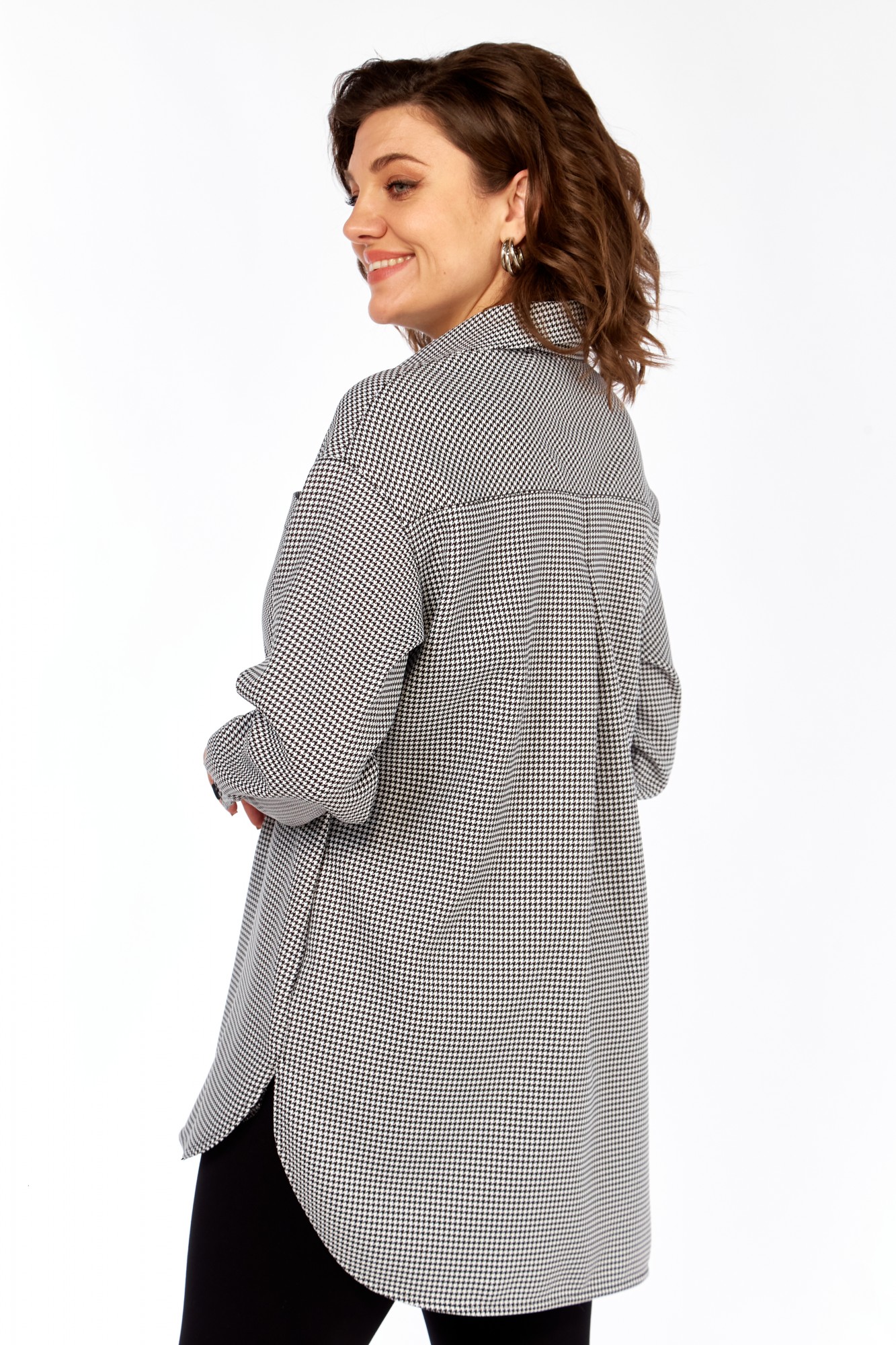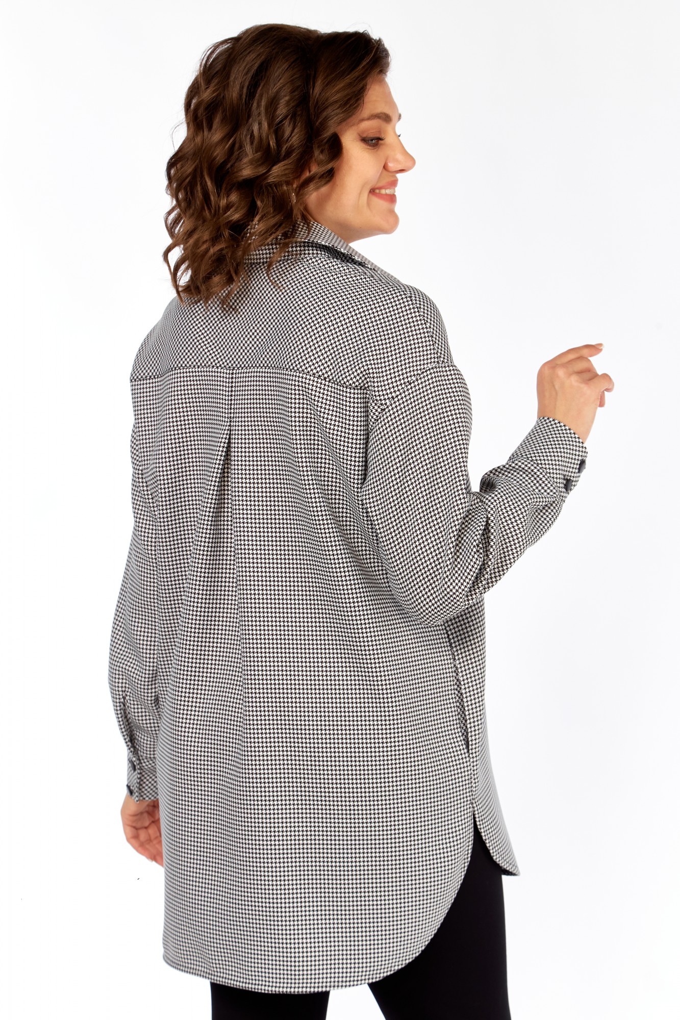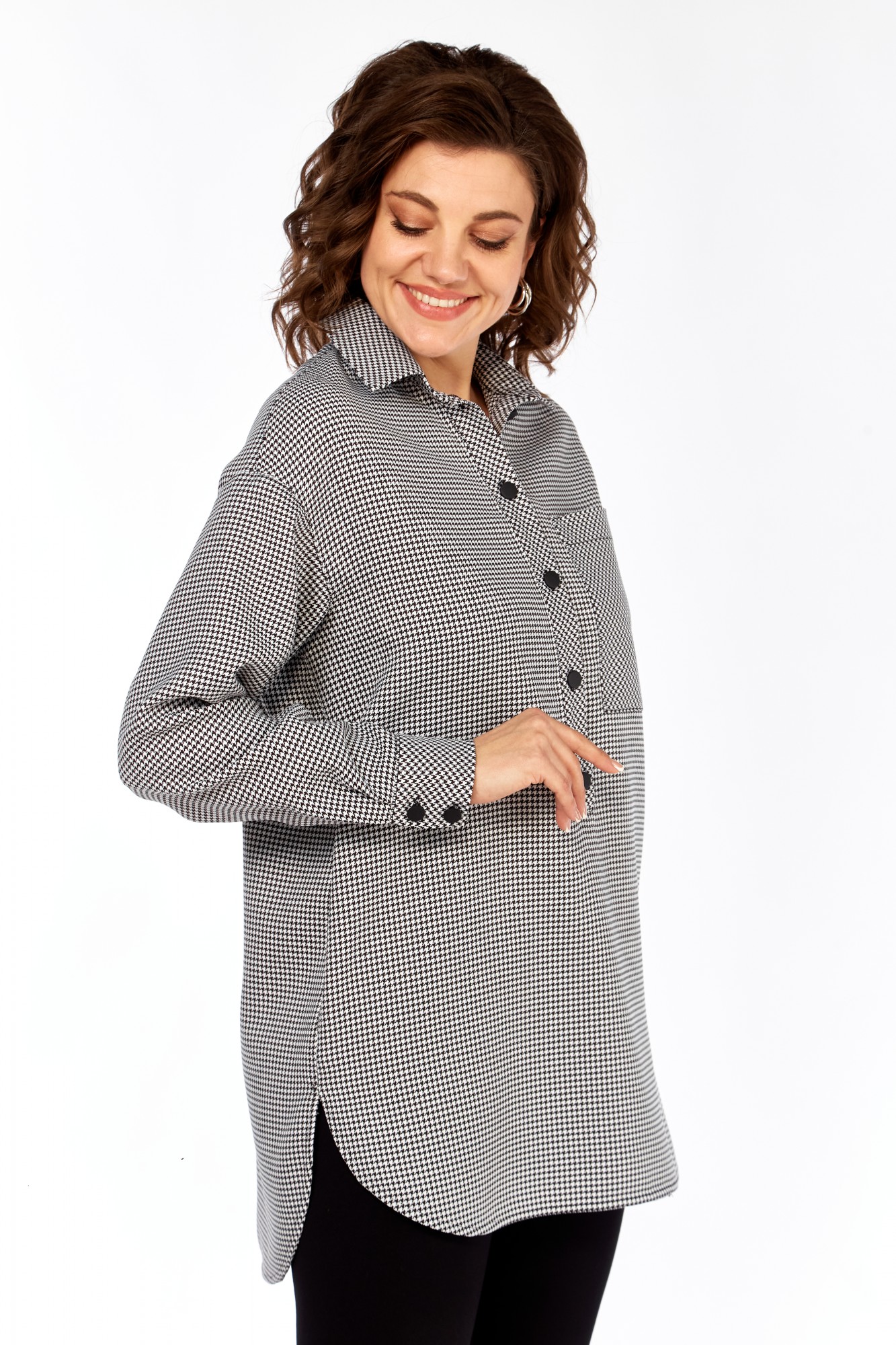Рубашка свободного кроя, в стиле оверсайз. Силуэт свободный. На переде с левой стороны карман, выкроенный по косой. В боковых швах карманы. Рукав рубашечный с разрезом и складками, заканчивается манжетой, которая застегивается на 2 петли и пуговицы. Плечо спущенное, кокетка также выкроена по косой. На спинке по центру складка. Спинка длиннее переда, низ спинки и переда скруглен к боковым. Планка переда выполнена не до конца детали.