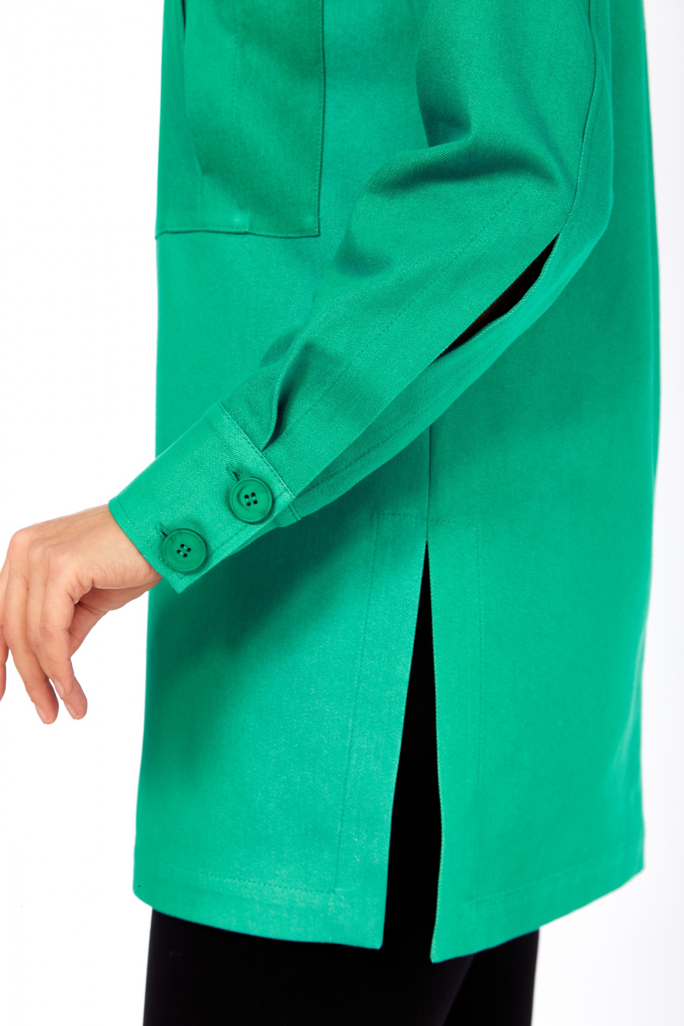 Рубашка свободного кроя, в стиле оверсайз. Силуэт свободный. На переде настрочены 2 фантазийных кармана. По боковым швам разрезы, отстроченные широкой отделочной строчкой. Рукав длинный двухшовный с длинным разрезом также отстроченным широкой отделкой. Плечо спущенное.