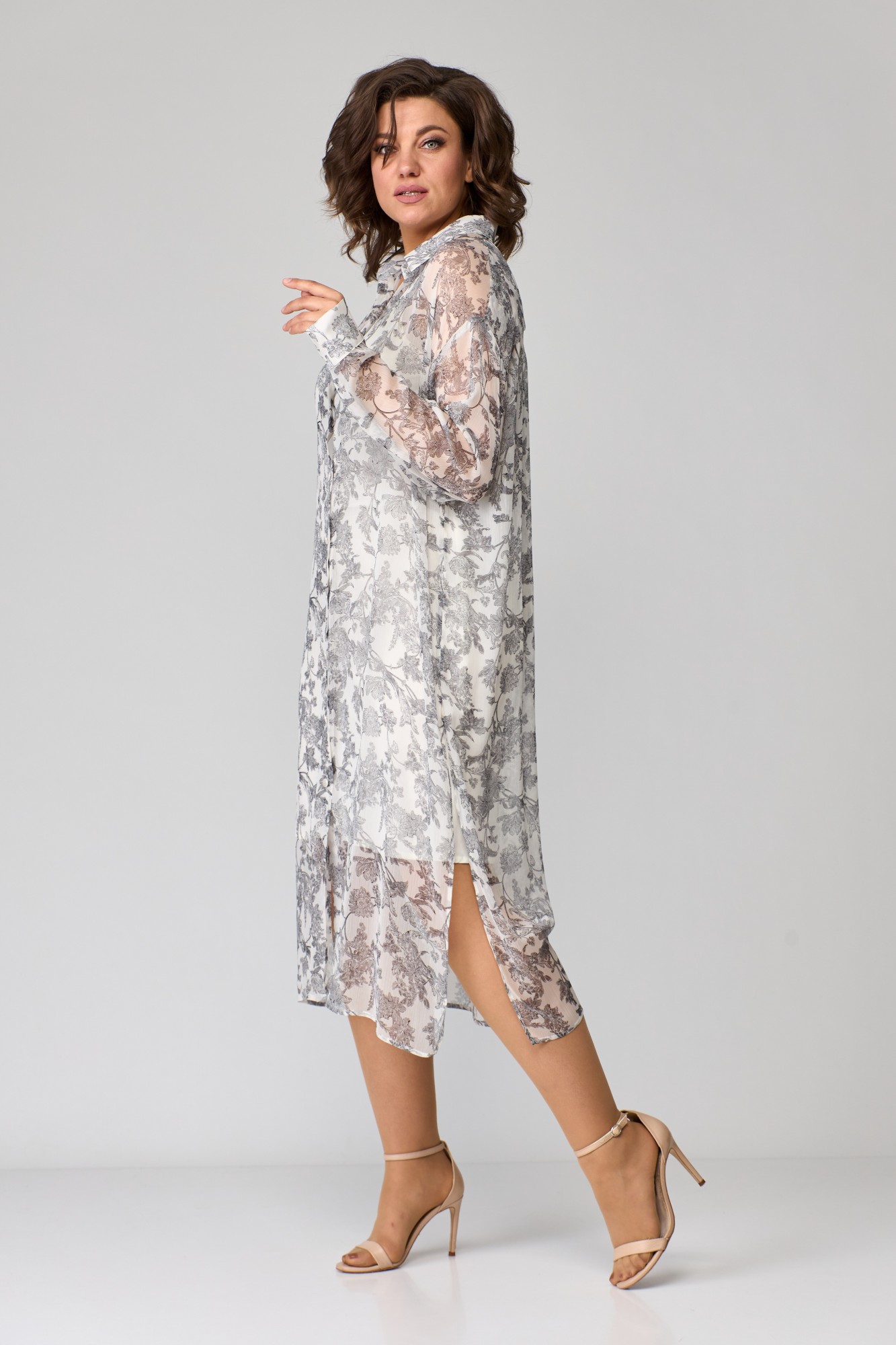 Рубашка свободного силуэта, прямого кроя, удлиненная. Воротник рубашечный классический. Центральная планка, петли-пуговицы. На спинке кокетка,от кокетки по центру спинки маленькая сборка. Спущенная линия плеча, низ рукава заканчивается притачной манжетой, застегивается на 2 петли и пуговицы. По бокам разрезы. Длина плеча-23см, длина рукава+манжет-57см, длина по спинке-120см. Длина разреза 51см. Ткань чуть-чуть жатый шифон.