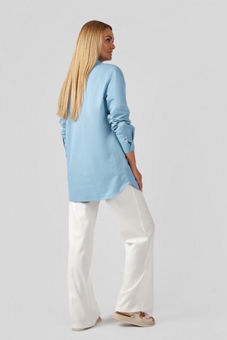 Блузка женская свободного покроя, удлиненная с рубашечным рукавом на манжете по низу,по переду на уровне груди -накладной карман ,застежка спереди на планку с пуговицами ,воротник рубашечный на стойке,низ изделия-фигурный,с закругленными разрезами по боковым швам.
