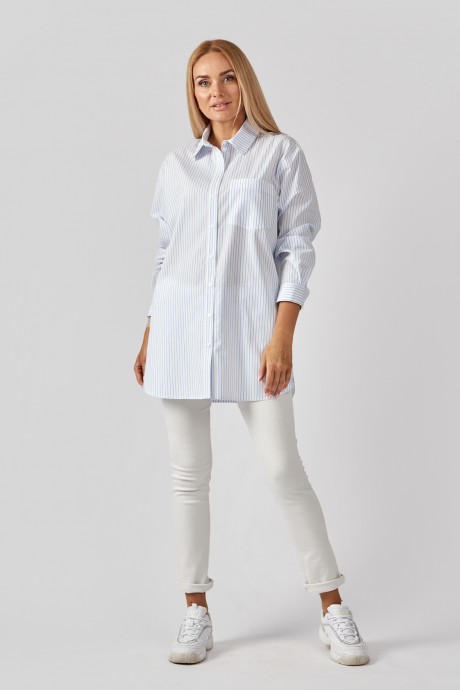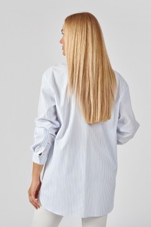 Блузка женская свободного покроя, удлиненная с рубашечным рукавом на манжете по низу,по переду на уровне груди -накладной карман ,застежка спереди на планку с пуговицами ,воротник рубашечный на стойке,низ изделия-фигурный,с закругленными разрезами по боковым швам.