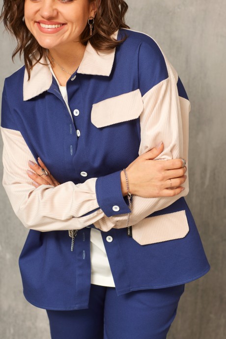 Эффектная, стильная рубашка из комбинации денима и вельвета - многофункциональный предмет гардероба, позволяющий чувствовать себя легко, свободно и стильно. Рубашка - отличная альтернатива жакету и идеально подходит для носки как первым, так и вторым слоем, а так же на распашку. Верхняя часть выполнена из денима, который придаёт изделию структуру, а вельветовые вставки добавляют мягкость и уют. Бежевый оттенок вельвета освежает и создаёт гармоничный контраст с глубоким сапфировым оттенком джинса. Блуза с контрастным воротником рубашечного типа. Перед блузы имеет застёжку на пуговицы контрастного цвета. На полочке расположены декоративные пришивные клапаны. Рукав втачной, со слегка спущенной линией плеча. Низ обработан манжетой с функциональной застёжкой. Низ блузы фигурной формы и застрочен вподгибку. На фото представлены брюки в тон арт. 6060.