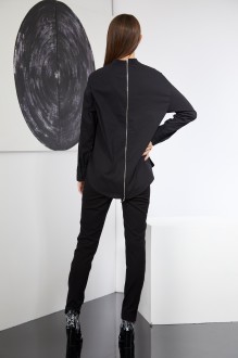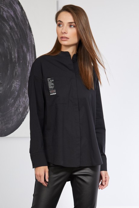 Блузка прямого силуэта с втачным рукавом на манжете, воротником стойкой, застежкой спереди на планку с пуговицами. Правая полочка с карманом и настрочным декором. Спинка со средним швом и разъемной молнией с металлическом звеном. Спинка рубашки длиннее переда.